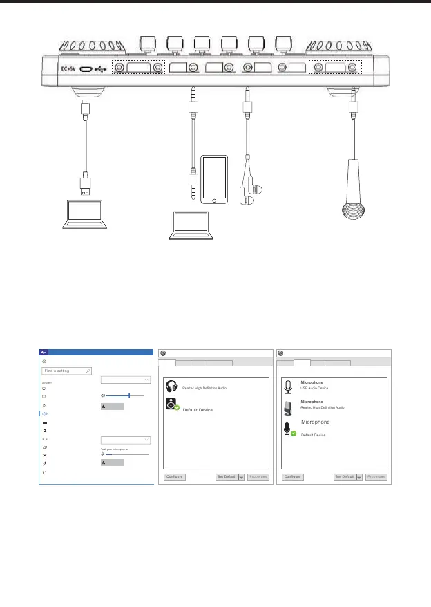 1. Connect the music source, monitoring earphones, and mic to the mixer as shown in the above.