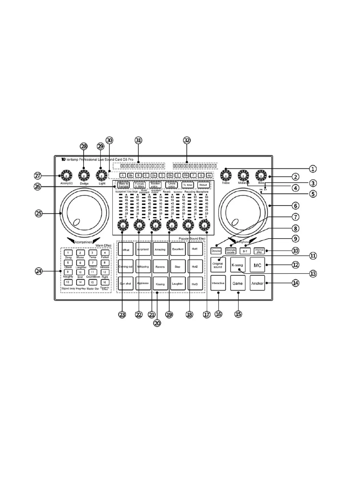 2. Bass knob: Adjust the bass effect of the microphone/Headset vocals.