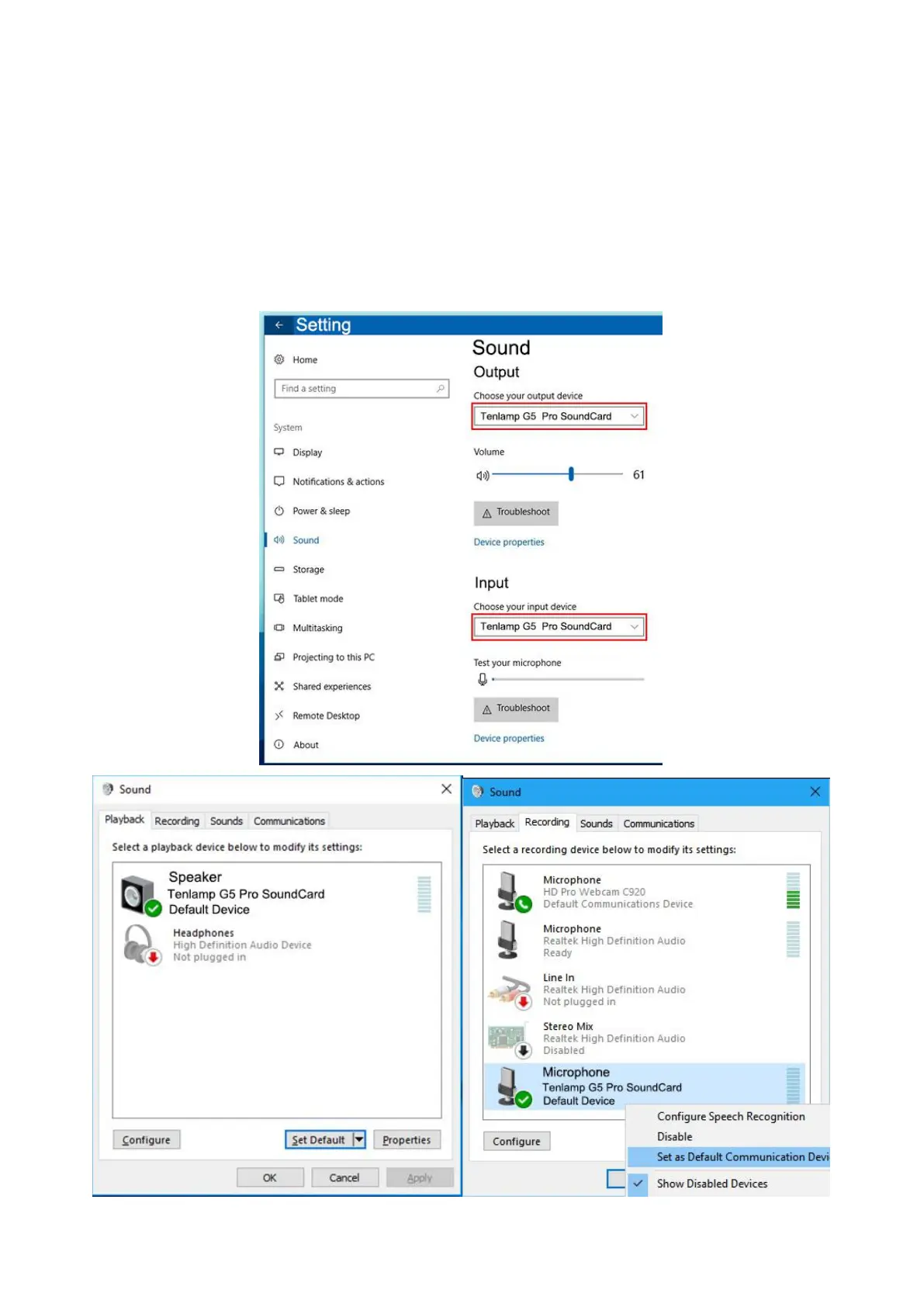 speaker on the playback page and the microphone on the recording page) to: "Tenlamp G5 Pro SoundCard" or