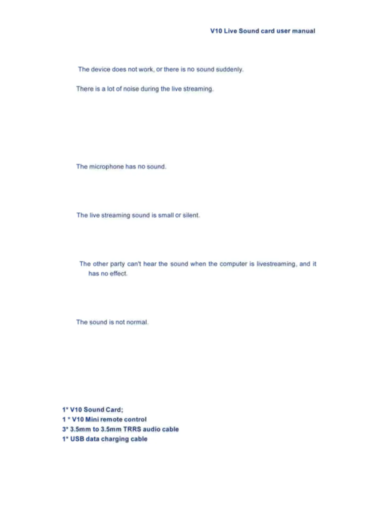 10. Accessories List of V10 sound card