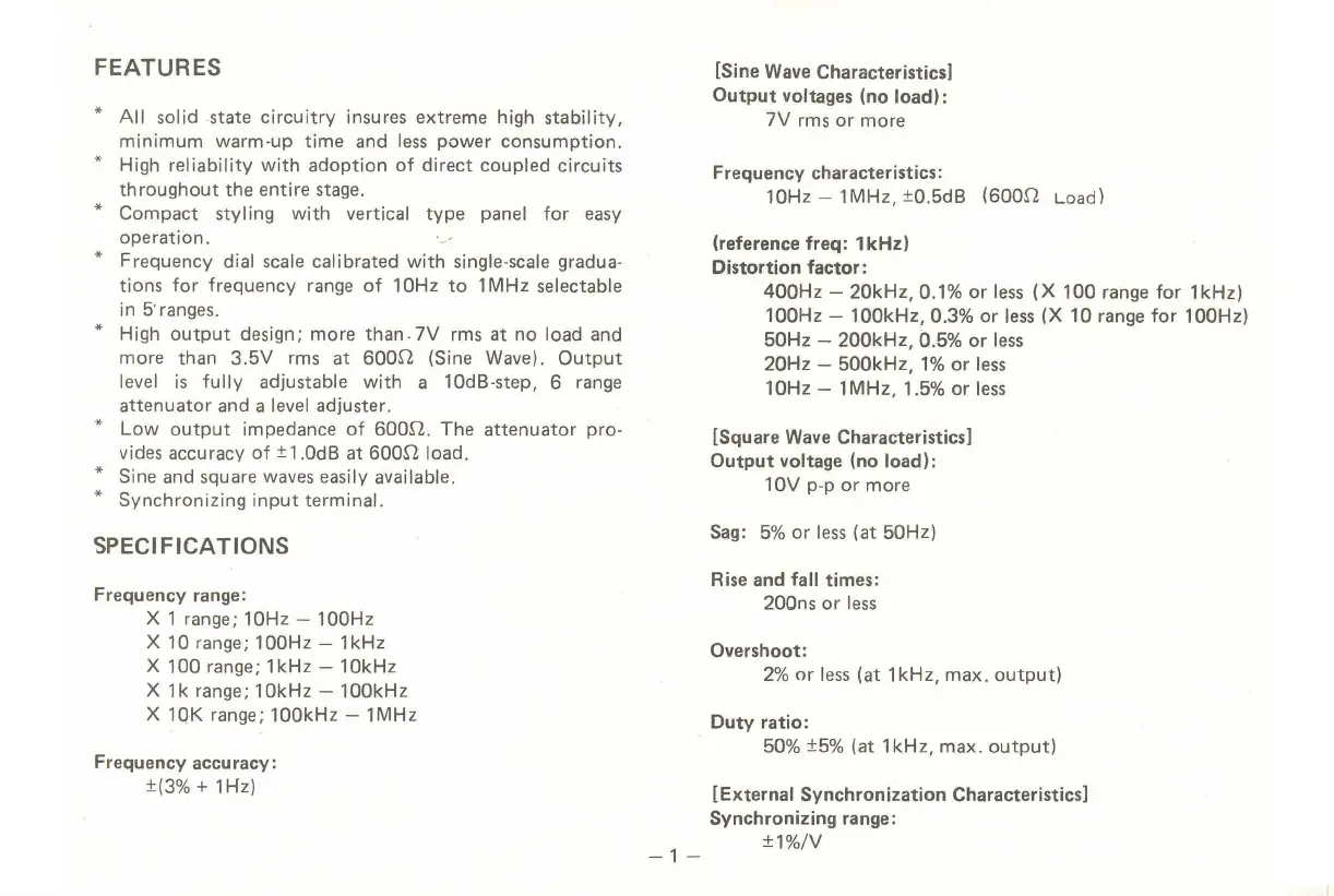 Tenma 72-455 - Features; Specifications; Frequency and Accuracy; Sine Wave Characteristics
