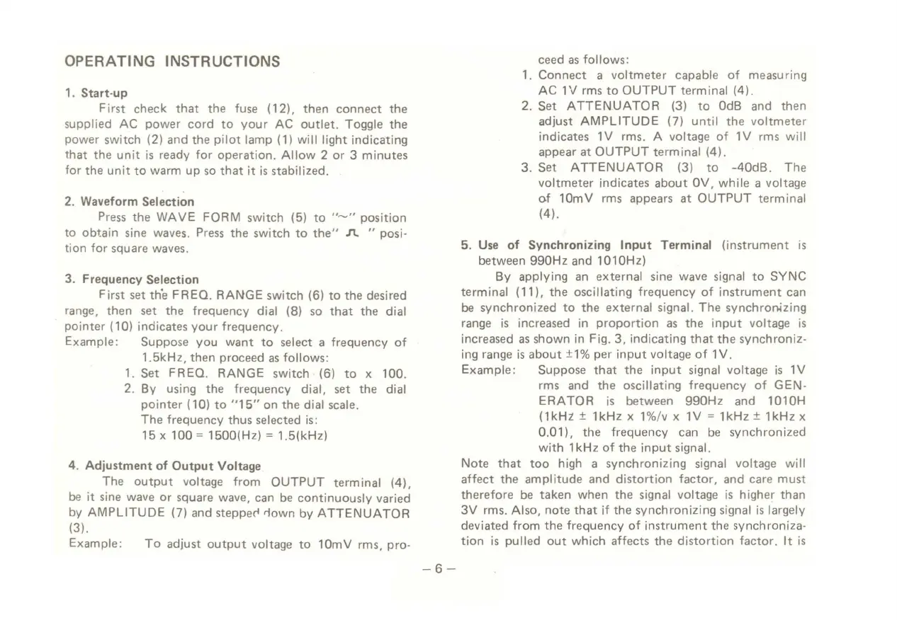 Tenma 72-455 - Operating Instructions; Start-up Procedure; Waveform Selection; Frequency Selection