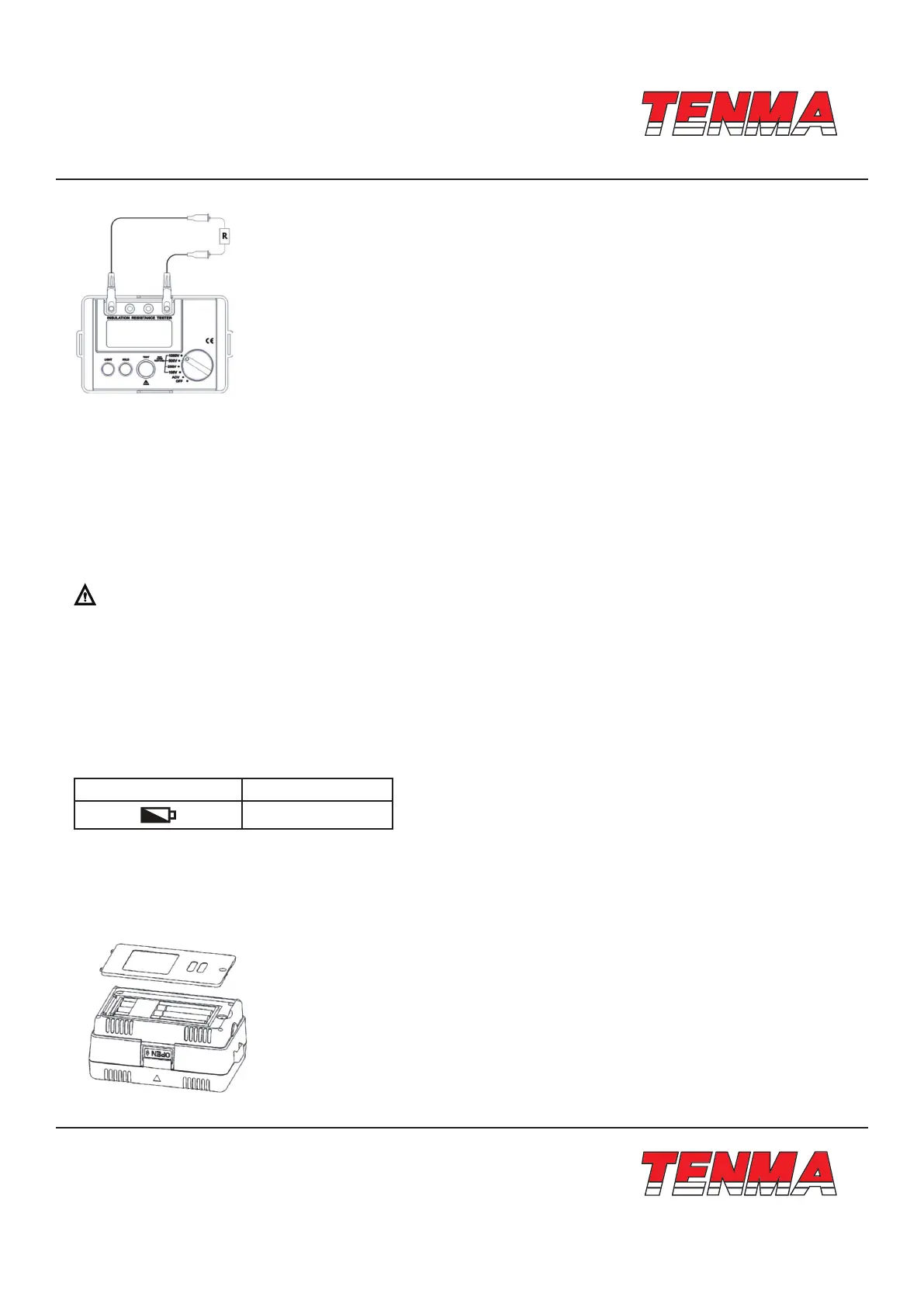 • Make sure the tested circuit is de-energized before measurement. Do not measure the insulation of any energized equip-