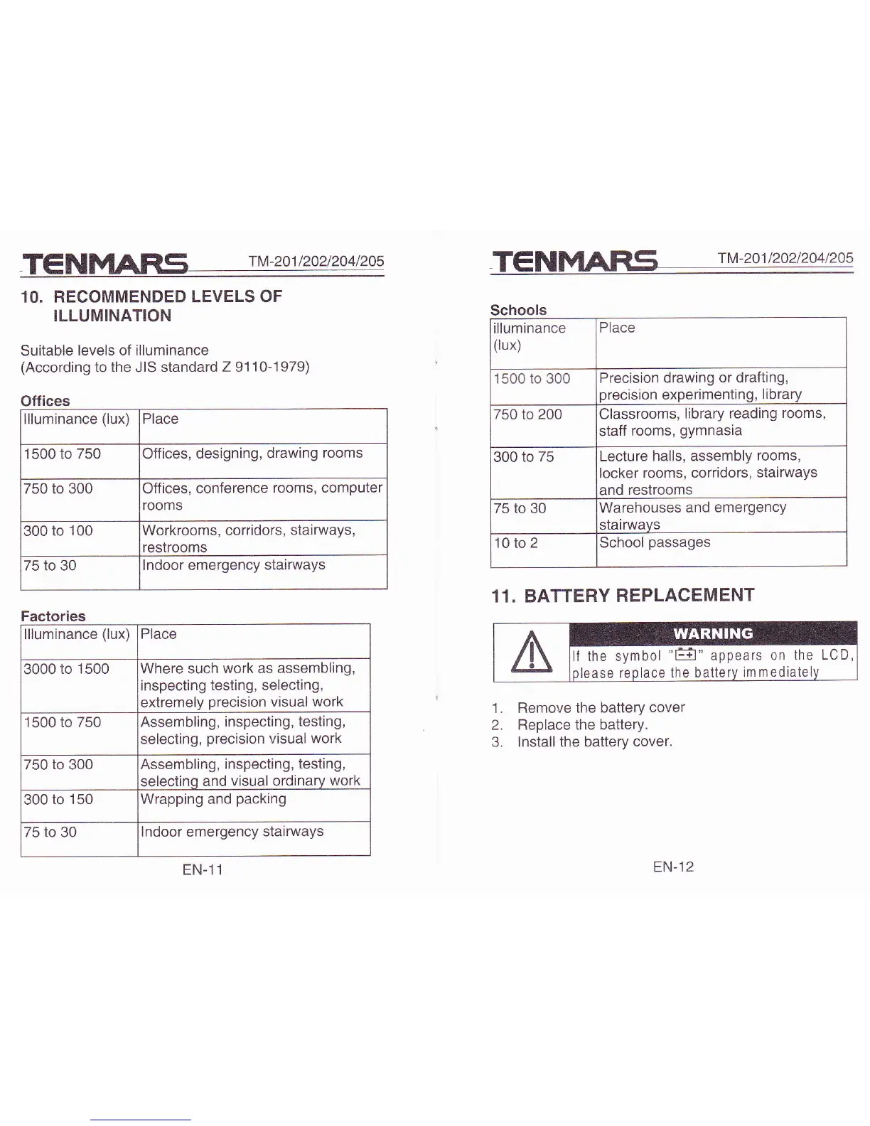 Tenmars TM205 - Recommended Levels of Illumination; Battery Replacement