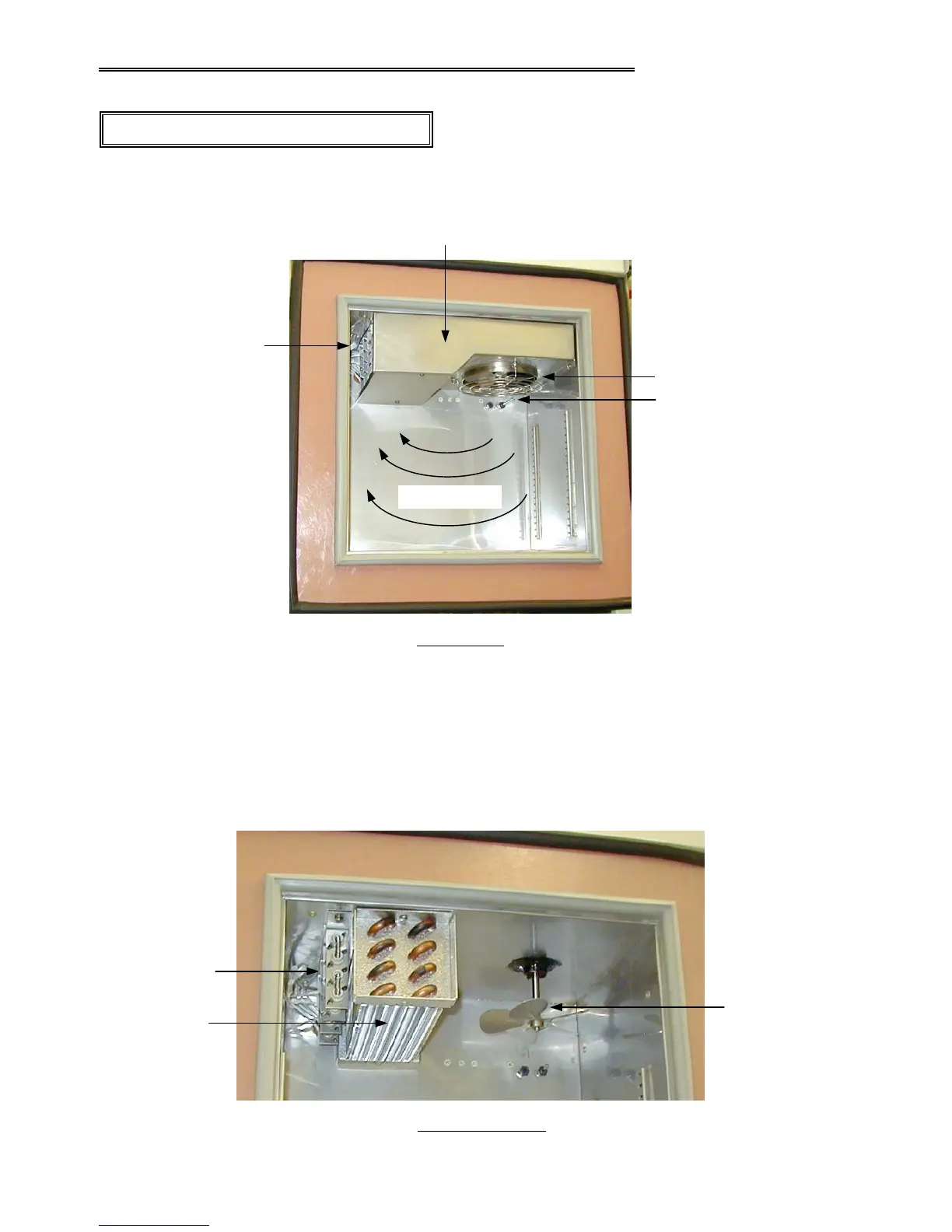 Chamber air is conditioned in the ceiling plenum where the circulation fan, heater elements, and refrigeration