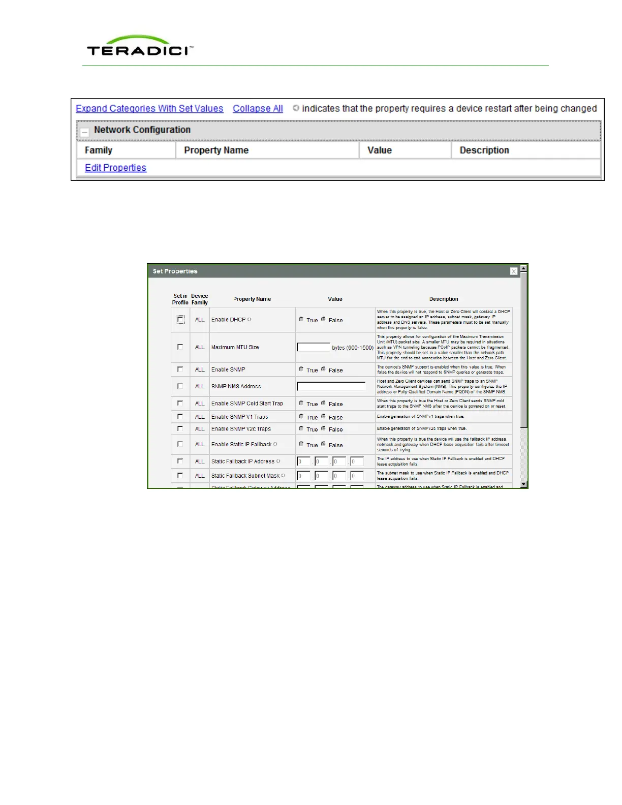 Figure 3-6: Set Properties Page for Network Configuration
