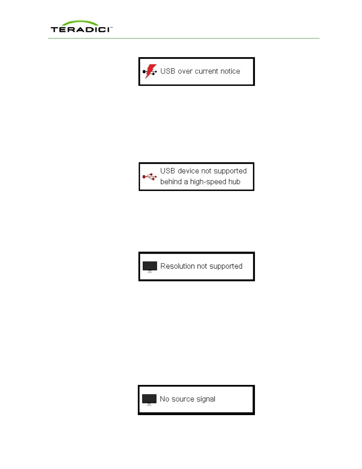 Improper connection of the host video source is denoted by two possible overlays. These