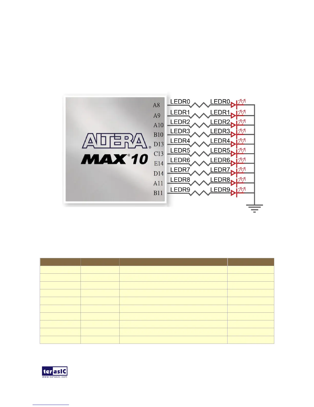 between LEDs and MAX 10 FPGA. Table 3-5 list the pin assignment of user LEDs.