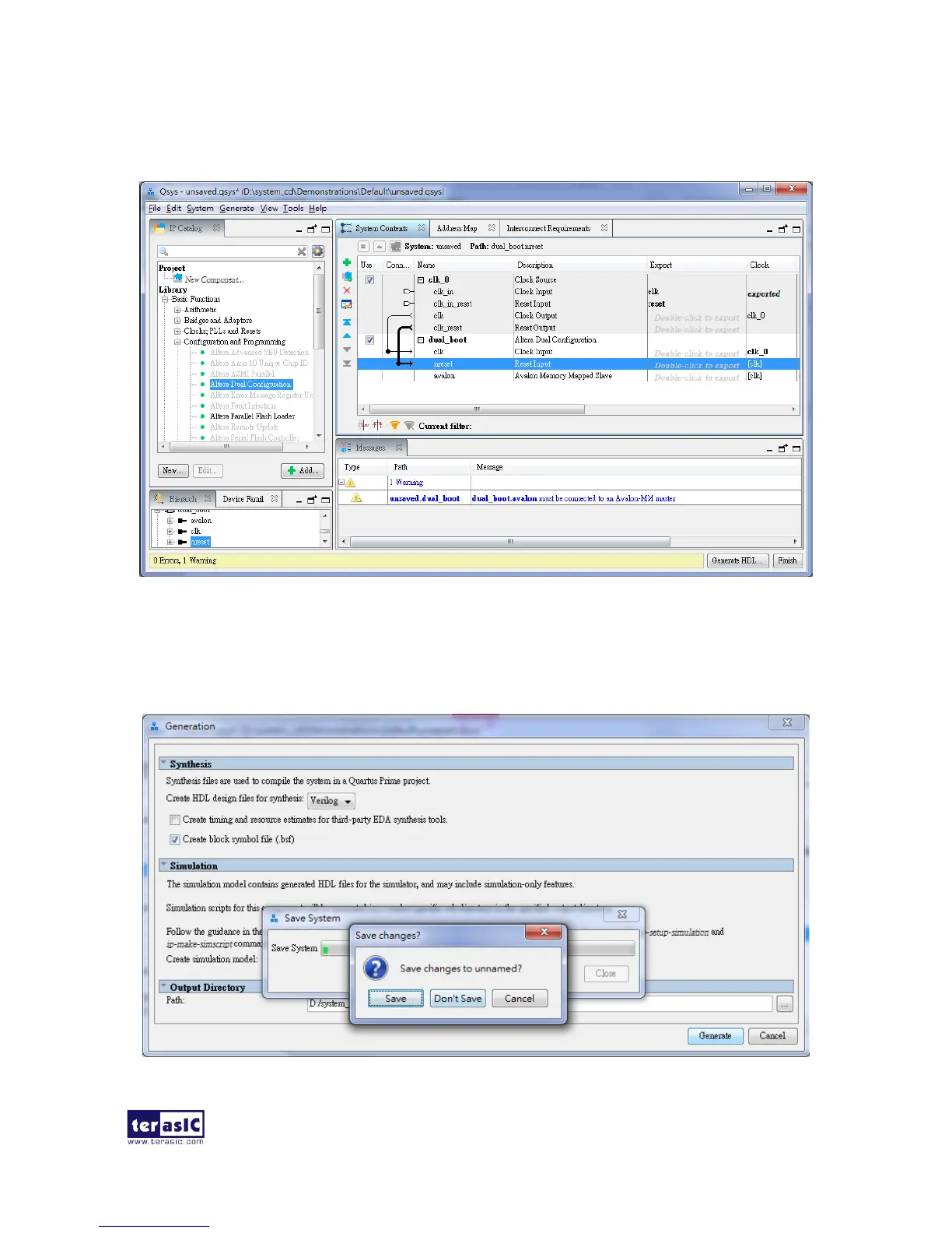 Figure 6-8. Click Save it as dual_boot.qsys and the generation start. If there is no error in the