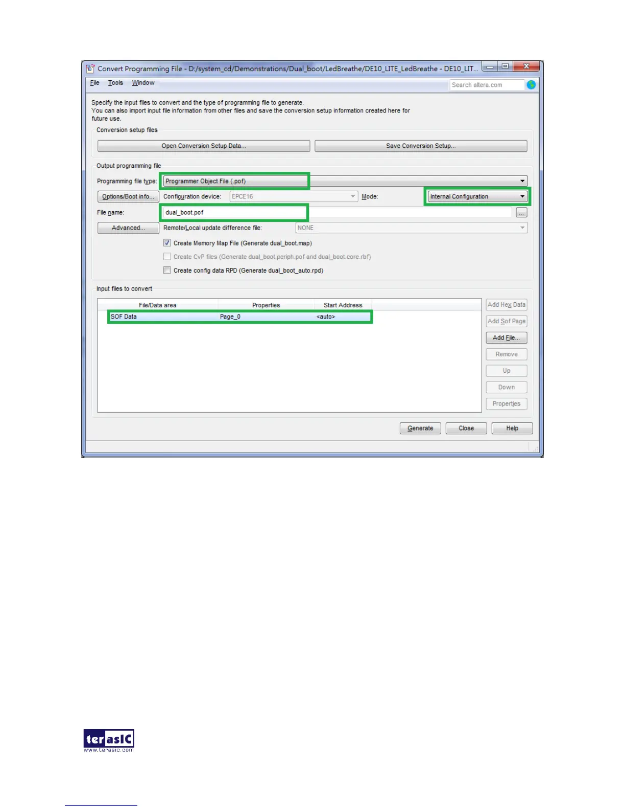 6. Click Add File and select the DE10_LITE_LedBreathe.sof of LedBreathe demo to be the sof