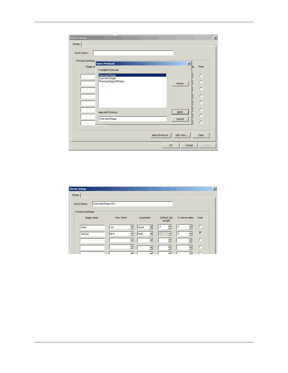 The Open Protocol window closes, and the Stress Setup window displays the default