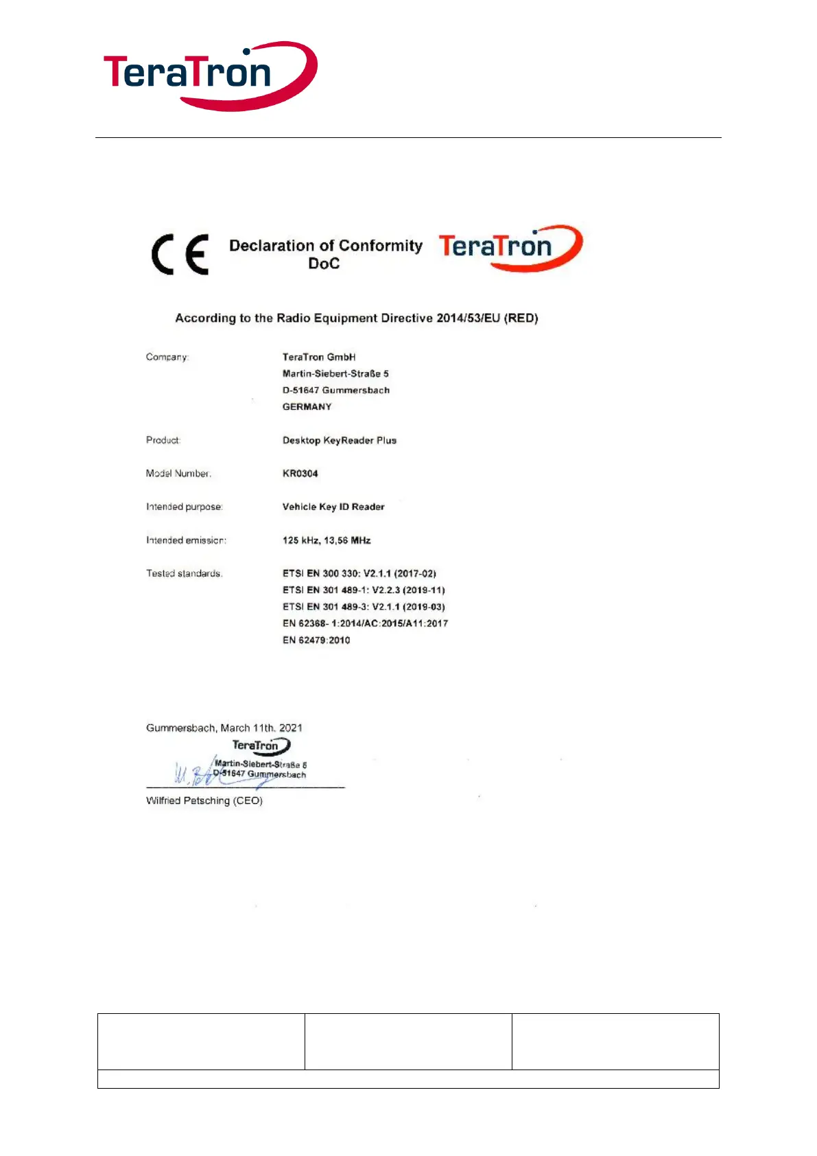 Hereby, TeraTron GmbH declares that the radio equipment type Desktop KeyReader Plus (KR0304) is