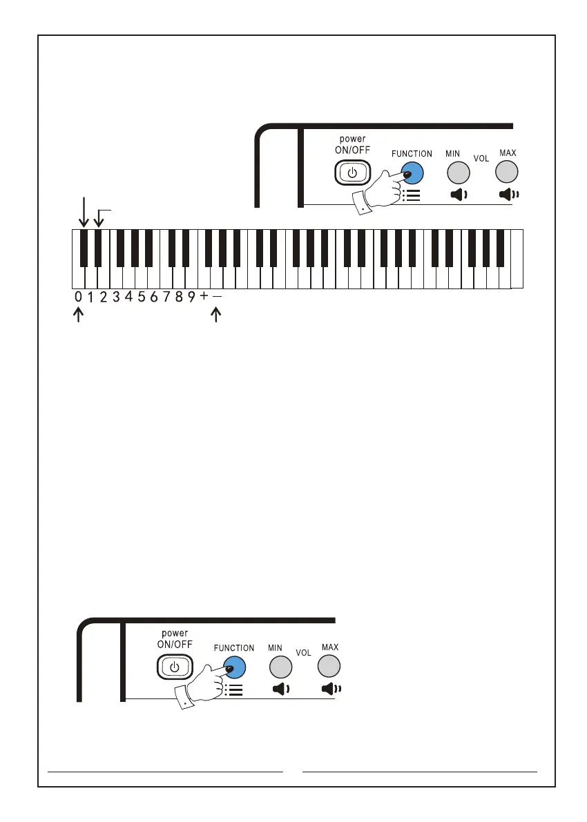 11.2 Accompaniment volume: first press and hold the ‘Function’ selector, press the