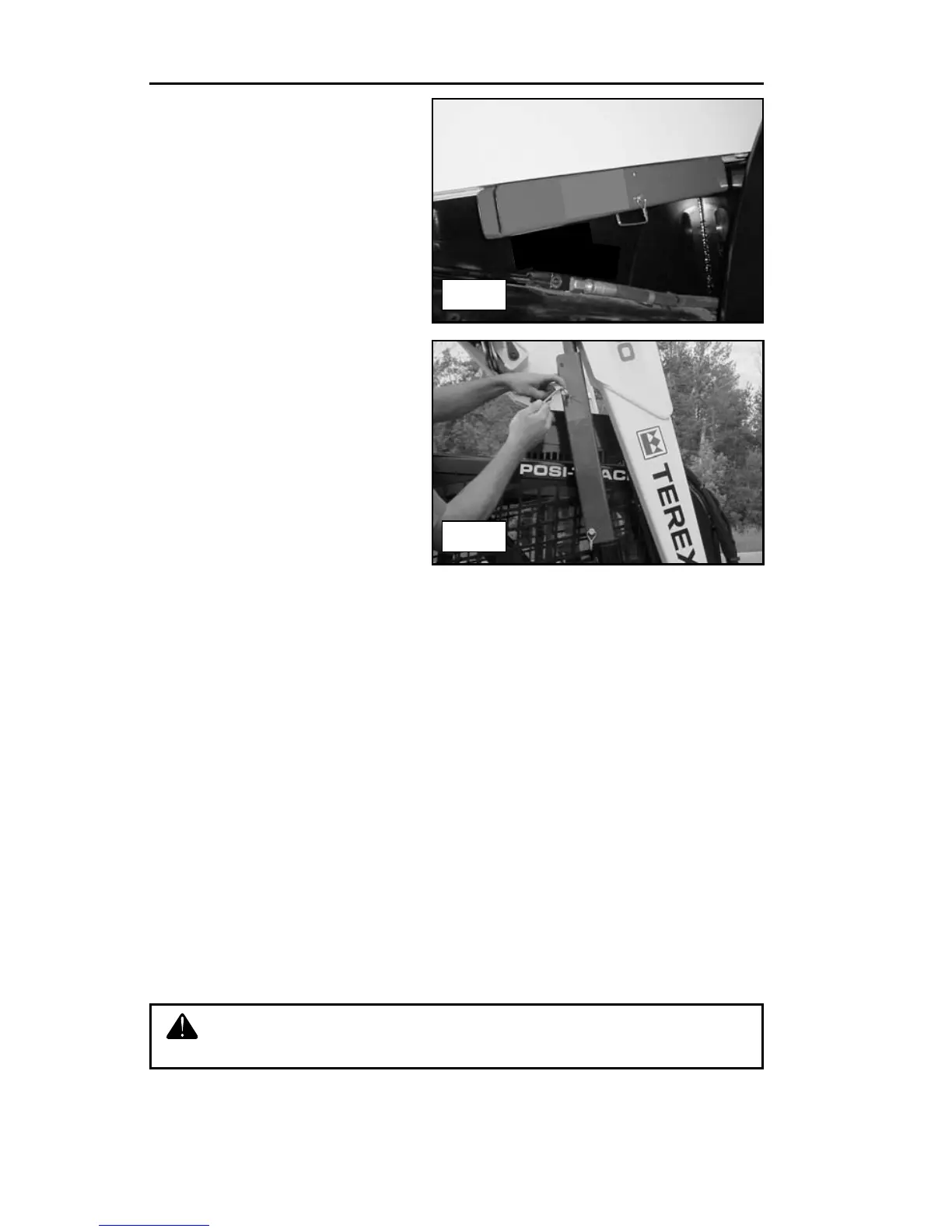 Do not go beneath unsecured lift arms. Always install the lift arm brace
