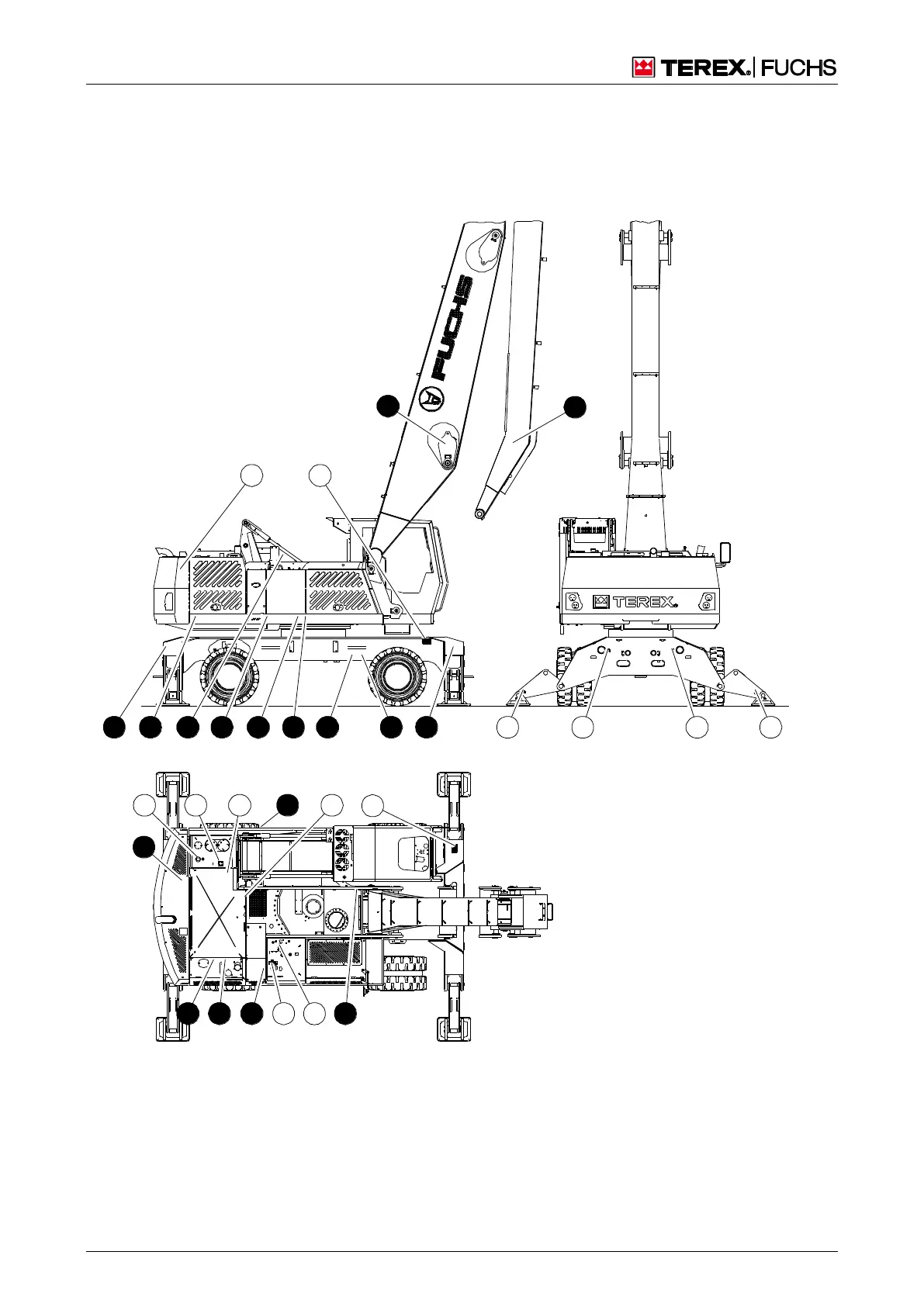 65 Decals in the pressure accumulator area (under the cab lift mechanism and under the bottom plate of