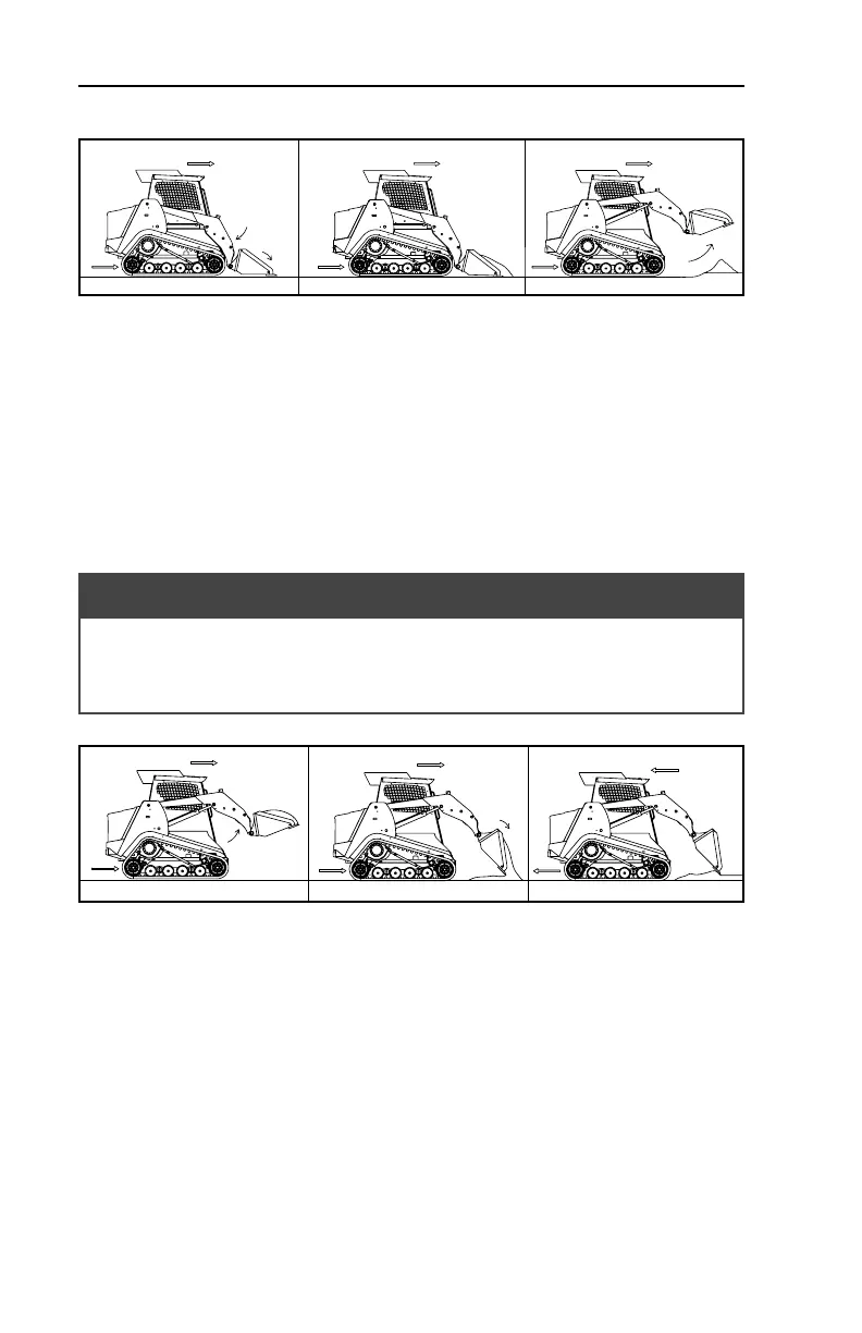 4. When full, curl the bucket and raise the lift arms simultaneously. Once clear,