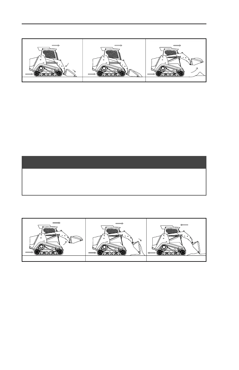 4. When full, curl the bucket and raise the lift arms simultaneously. Once clear,