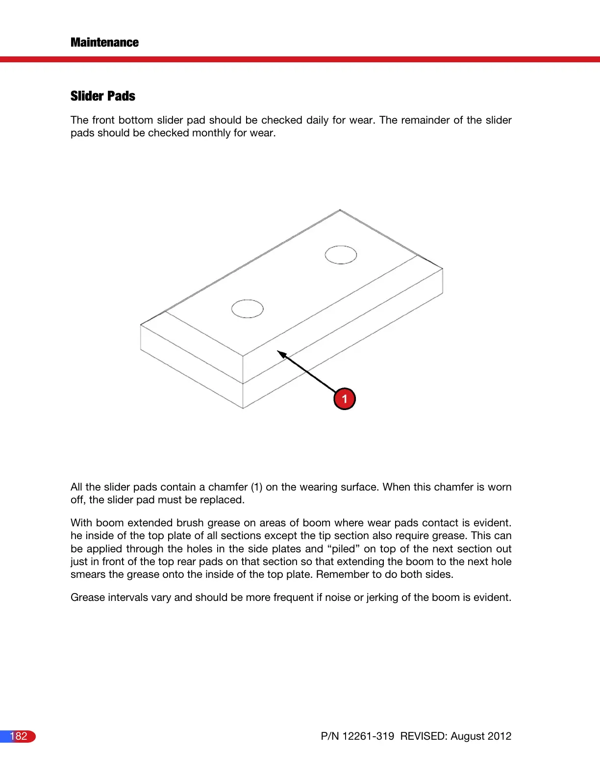 The front bottom slider pad should be checked daily for wear. The remainder of the slider