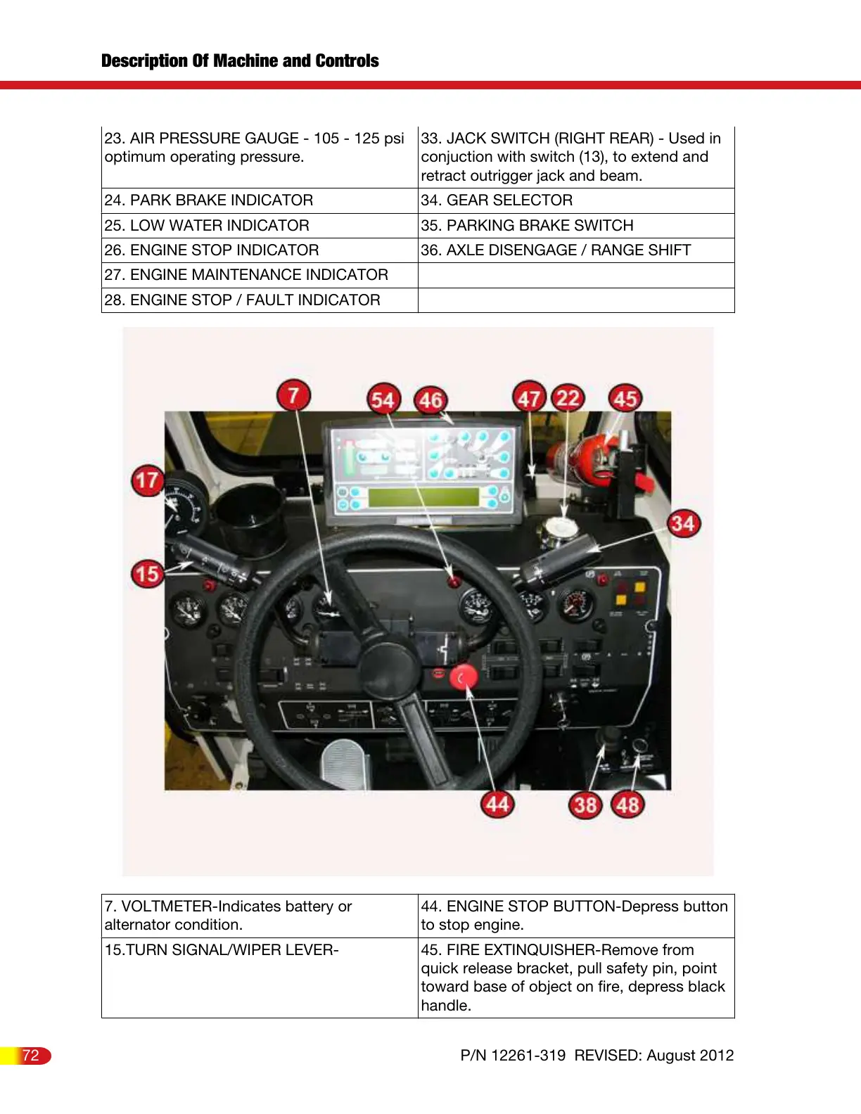 26. ENGINE STOP INDICATOR 36. AXLE DISENGAGE / RANGE SHIFT