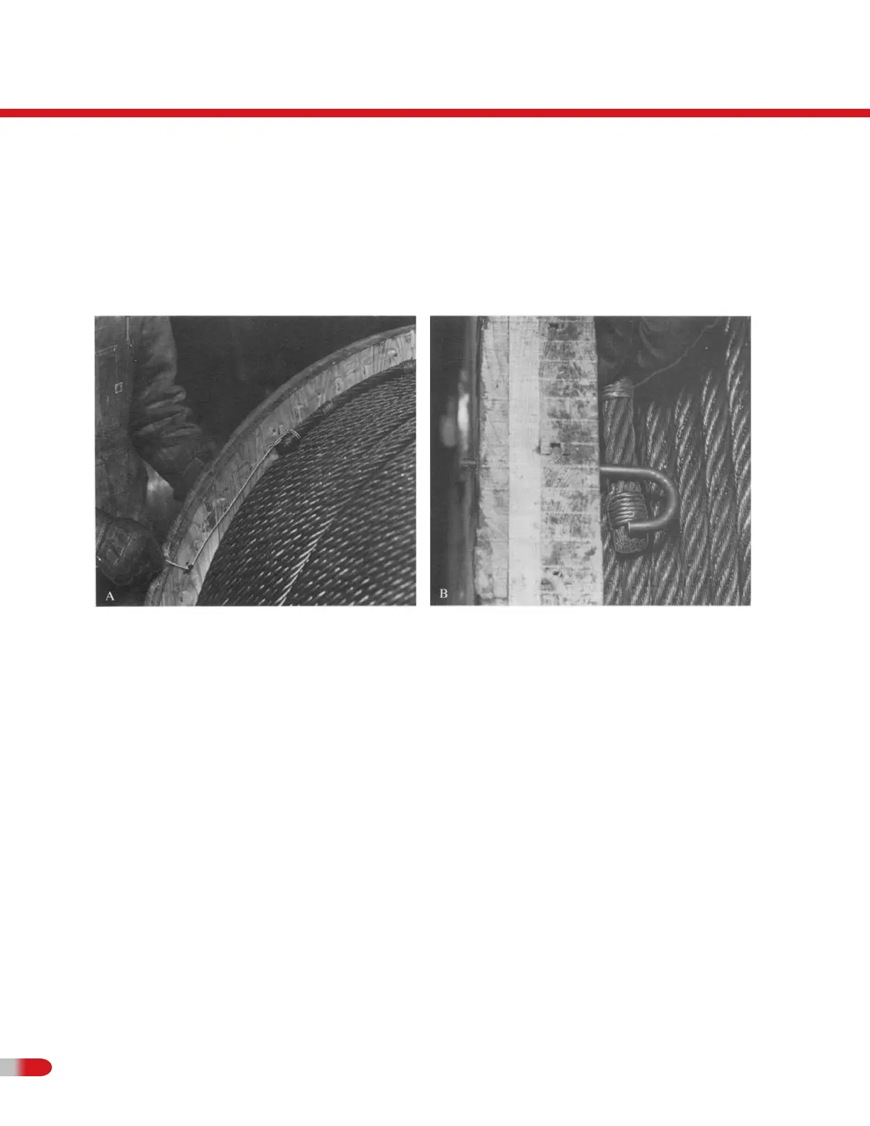 photos show two acceptable methods: A) one end of a wire "noose" holds the rope, and