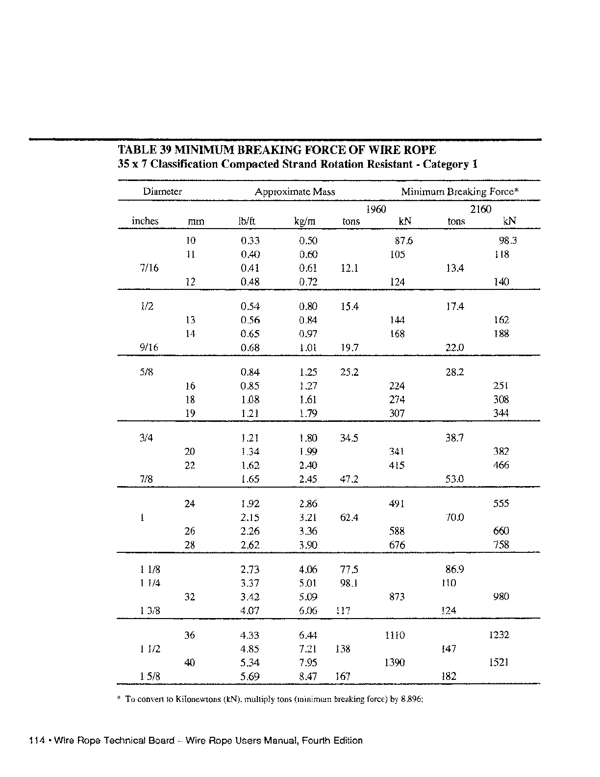 TABLE 39 MINIMUM BREAKING FORCE OF WIRE ROPE