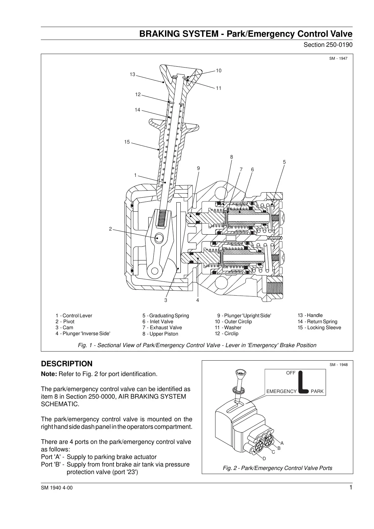 Fig. 1 - Sectional View of Park/Emergency Control Valve - Lever in 'Emergency' Brake Position
