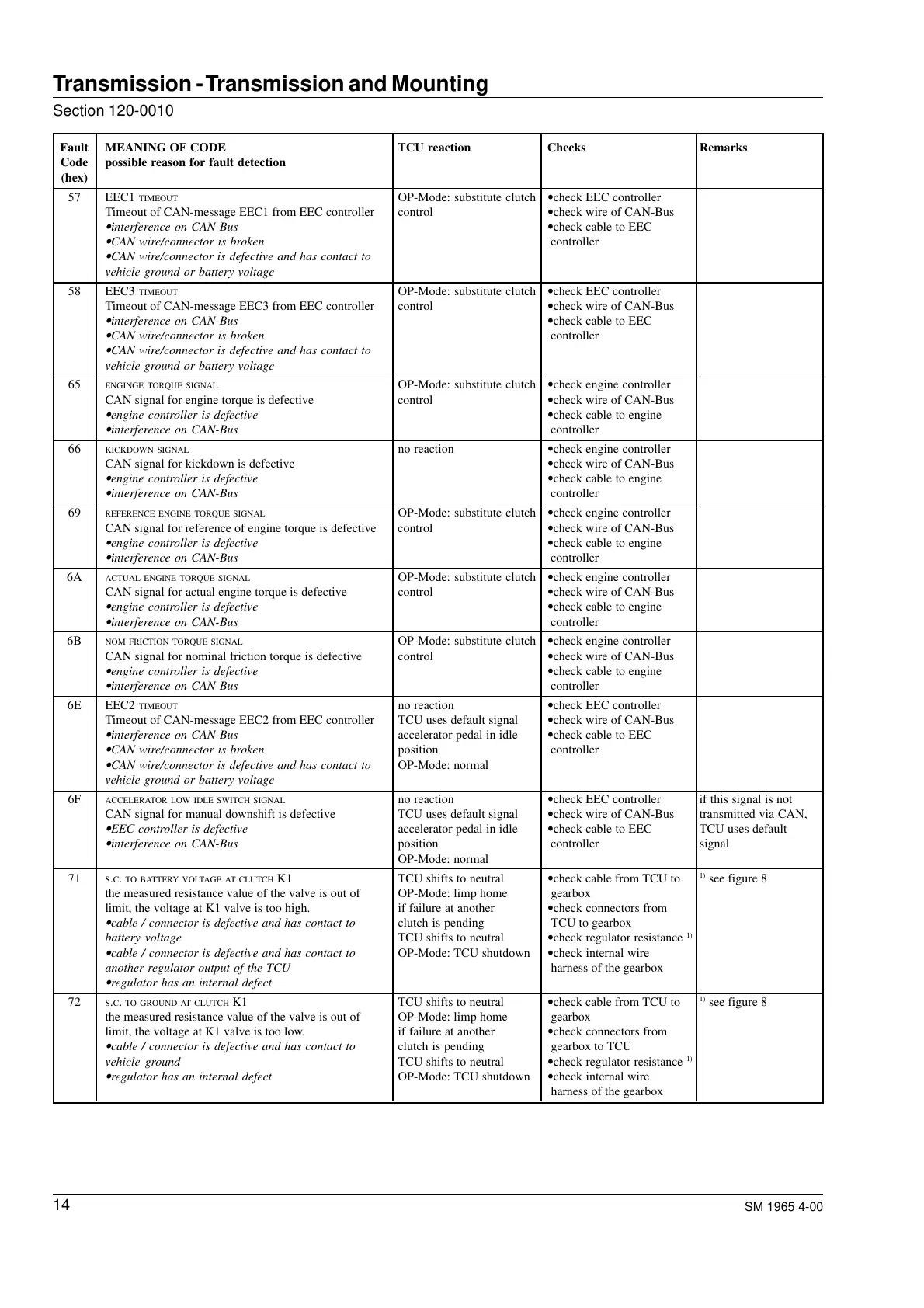Fault MEANING OF CODE TCU reaction Checks Remarks