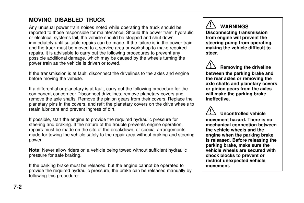 Note: Never allow riders on a vehicle being towed without sufficient hydraulic