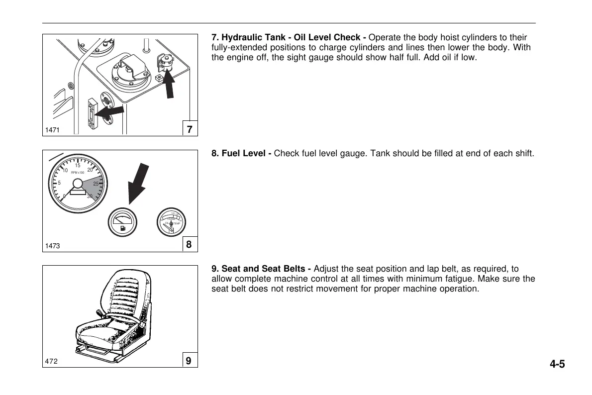 8. Fuel Level - Check fuel level gauge. Tank should be filled at end of each shift.