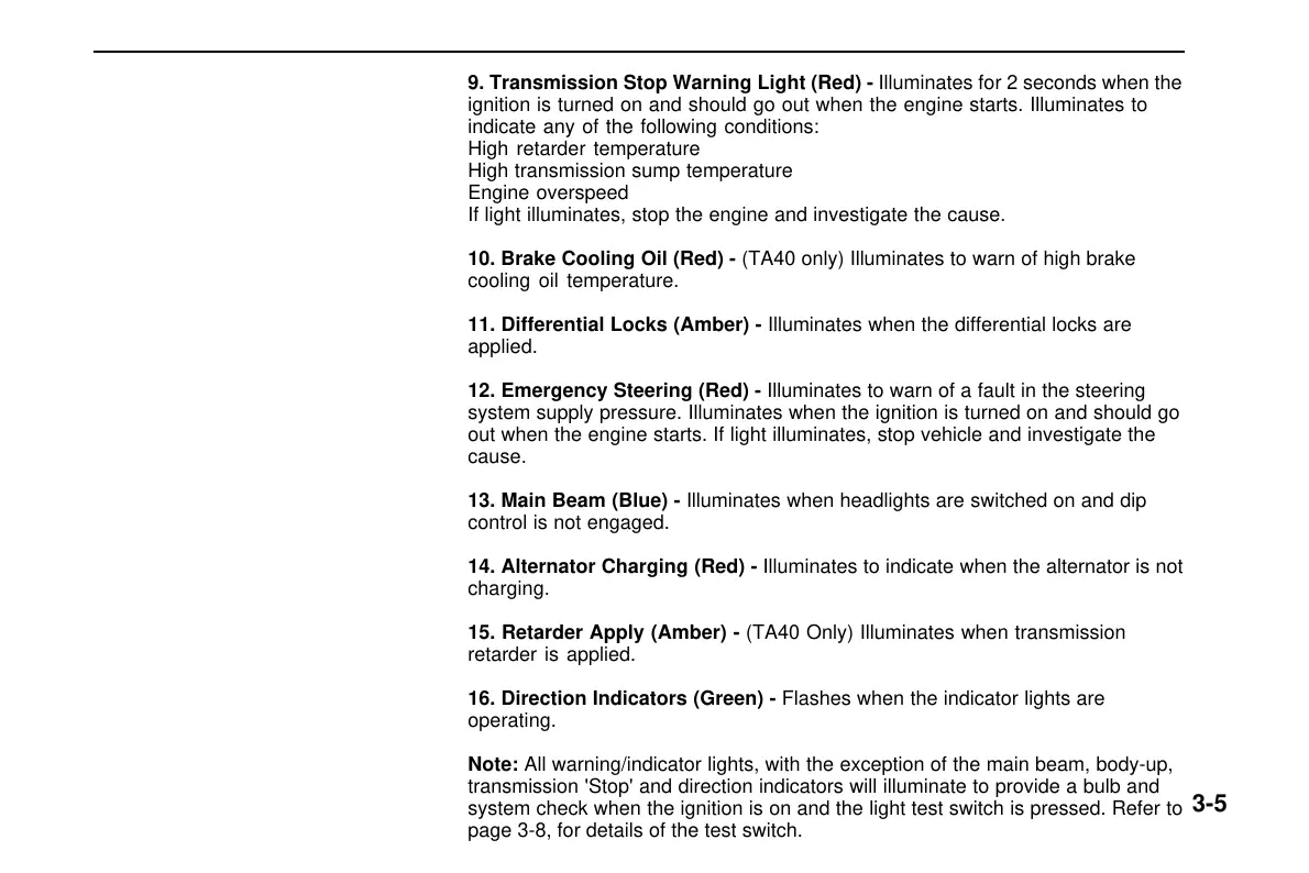 10. Brake Cooling Oil (Red) - (TA40 only) Illuminates to warn of high brake