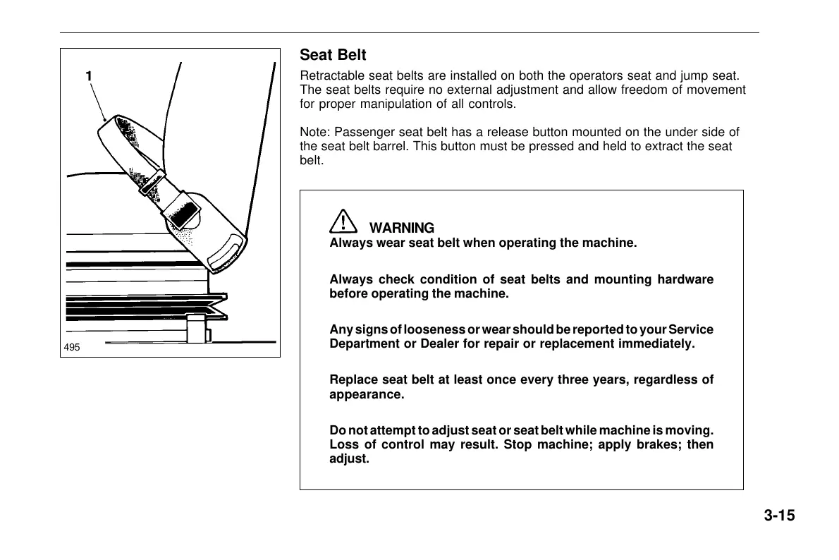 Do not attempt to adjust seat or seat belt while machine is moving.