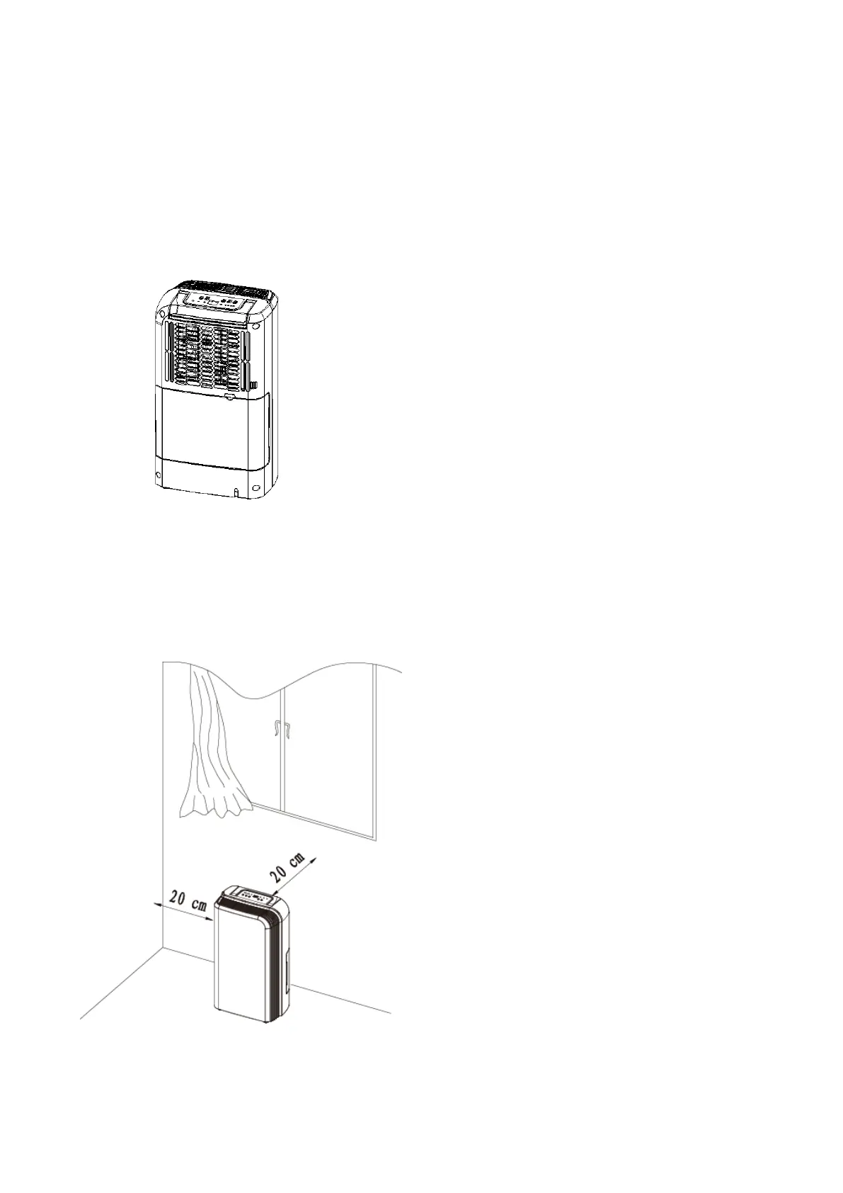Det minimiutrymme som behöver hållas omkring luftavfuktaren när den körs visas på den vänstra bilden.