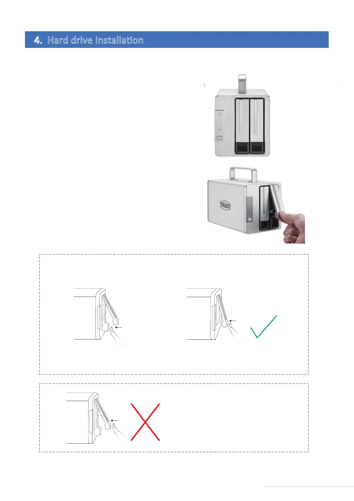 Prior to use, hard drives must be installed properly into the device. Therefore, if you have no hard drives for