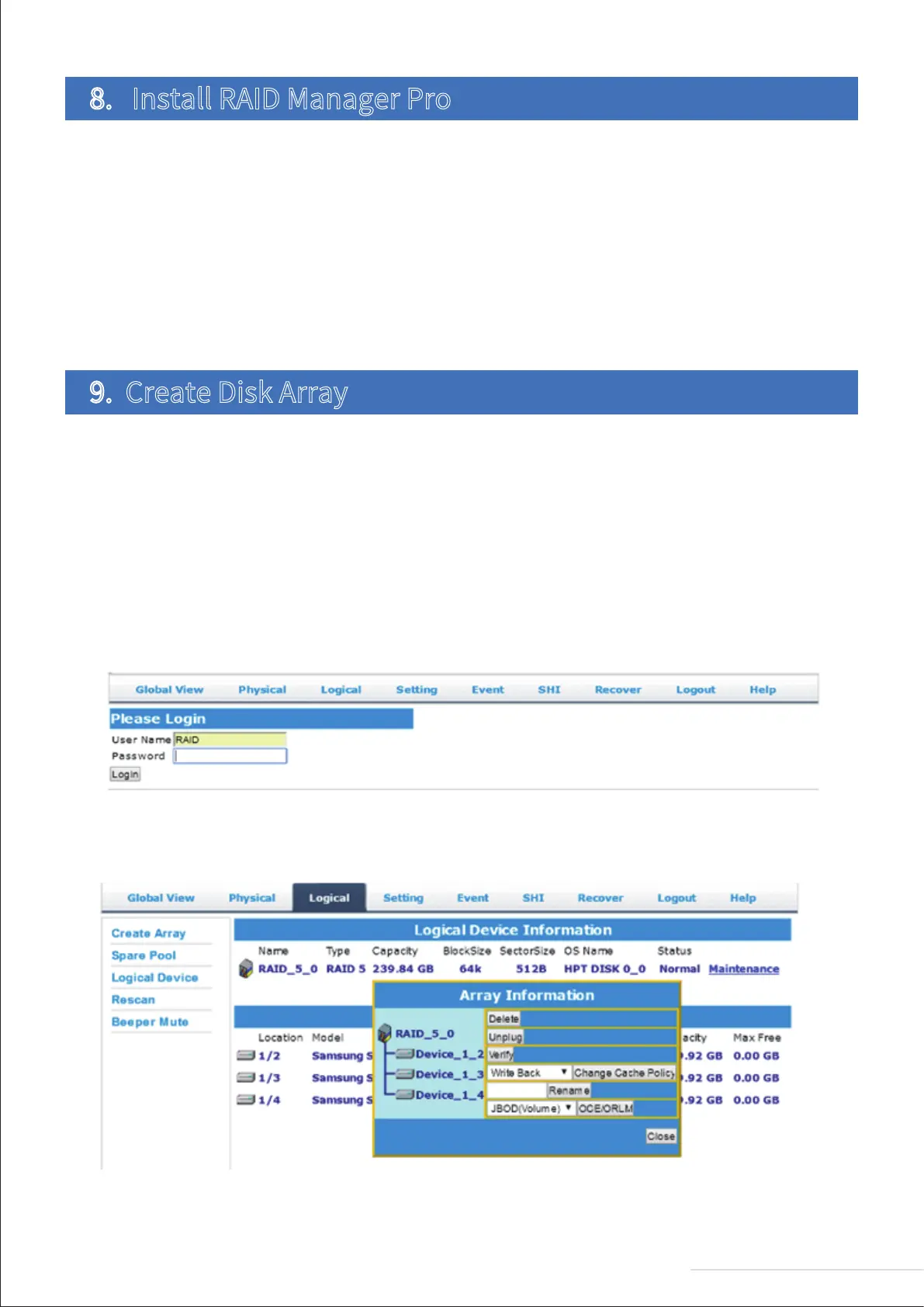 3.If your hard drive already contains disk array information, delete it. You can do this by going to Logical > Logical Device