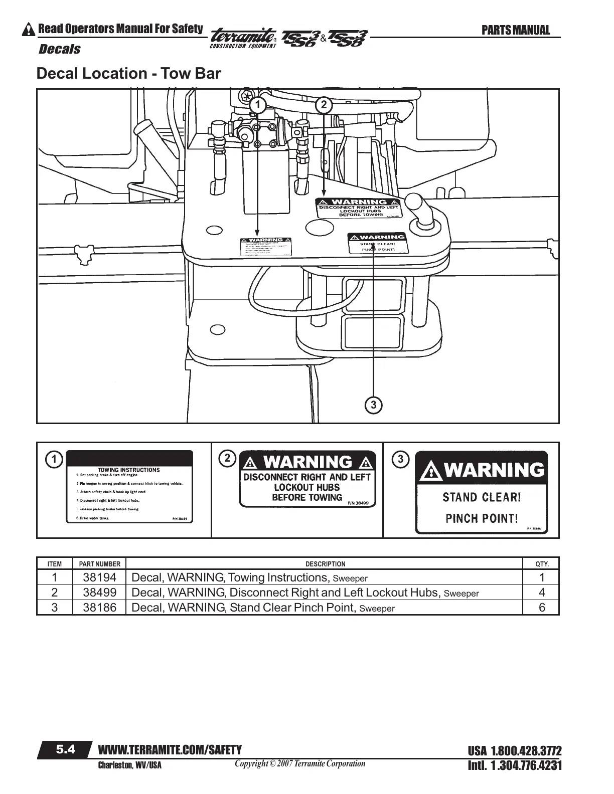 1 38194 Decal, WARNING, Towing Instructions, Sweeper 1