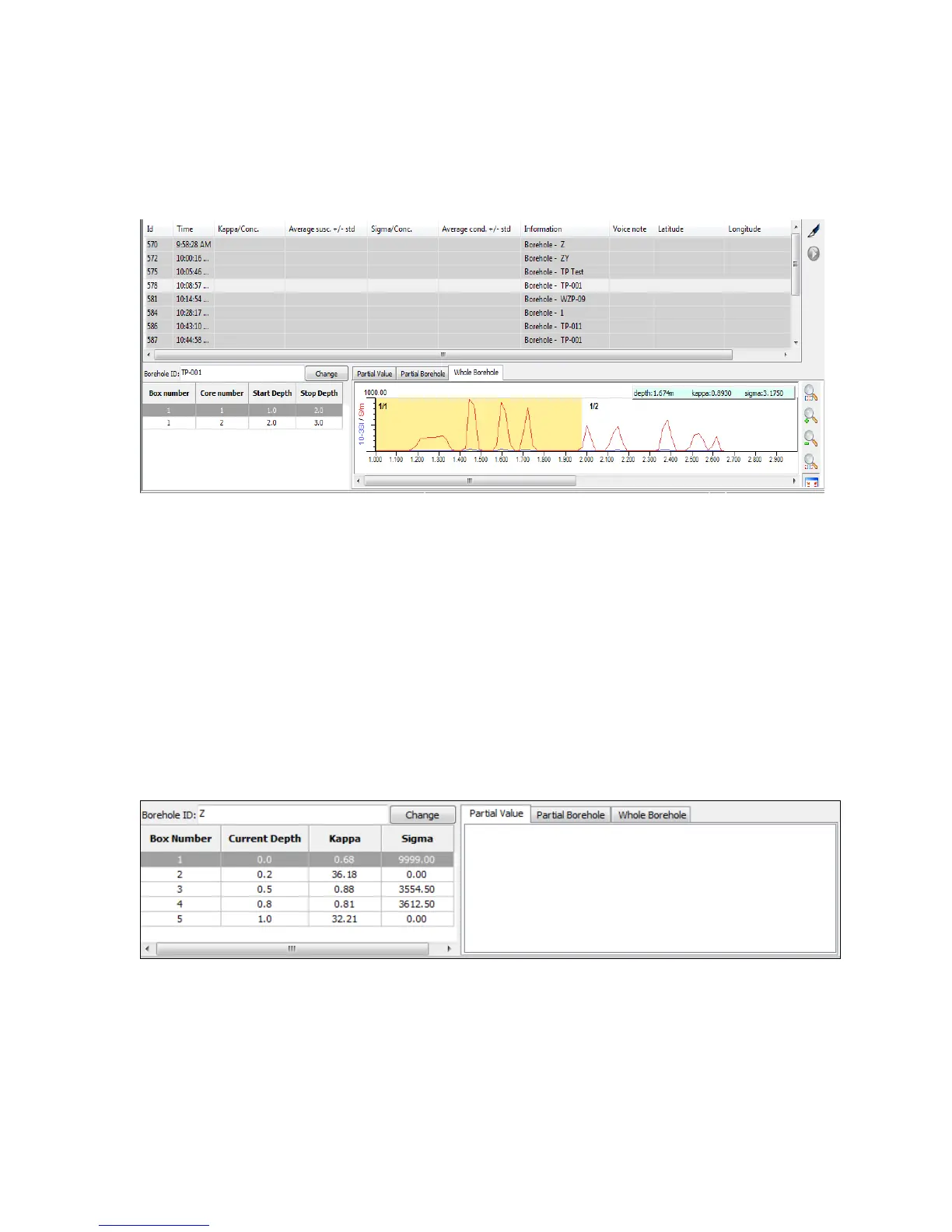 the reading values for susceptibility and conductivity. The borehole ID and the data filed