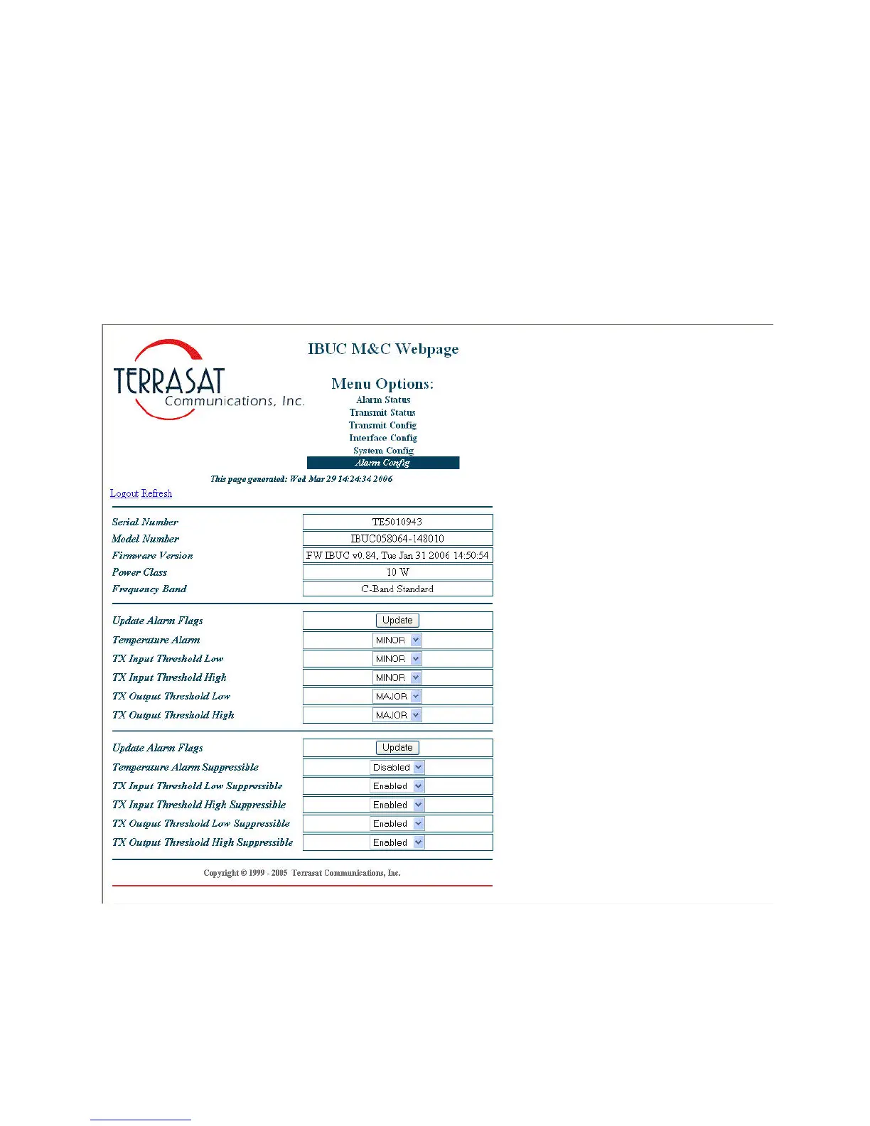 This page allows the operator to configure the alarms as Minor, Major or None. Major