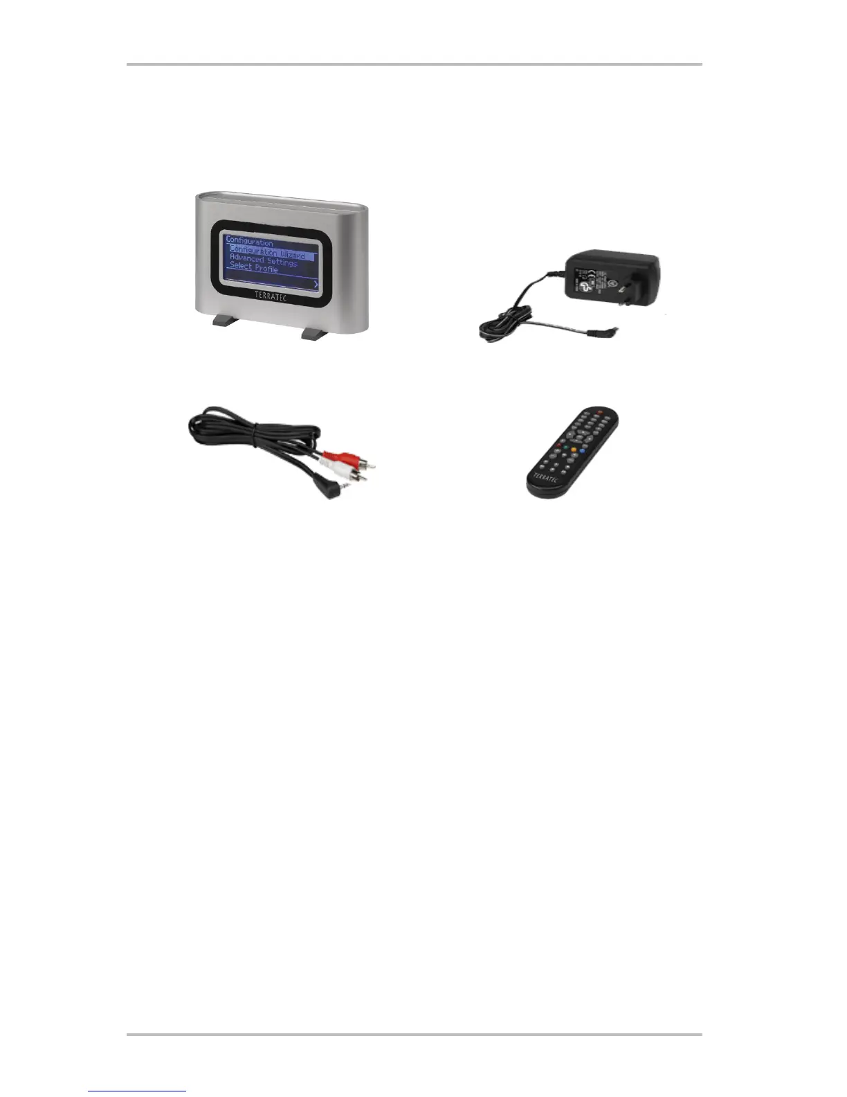 an audio cable (3.5 mm minijack to RCA), an infrared remote control including