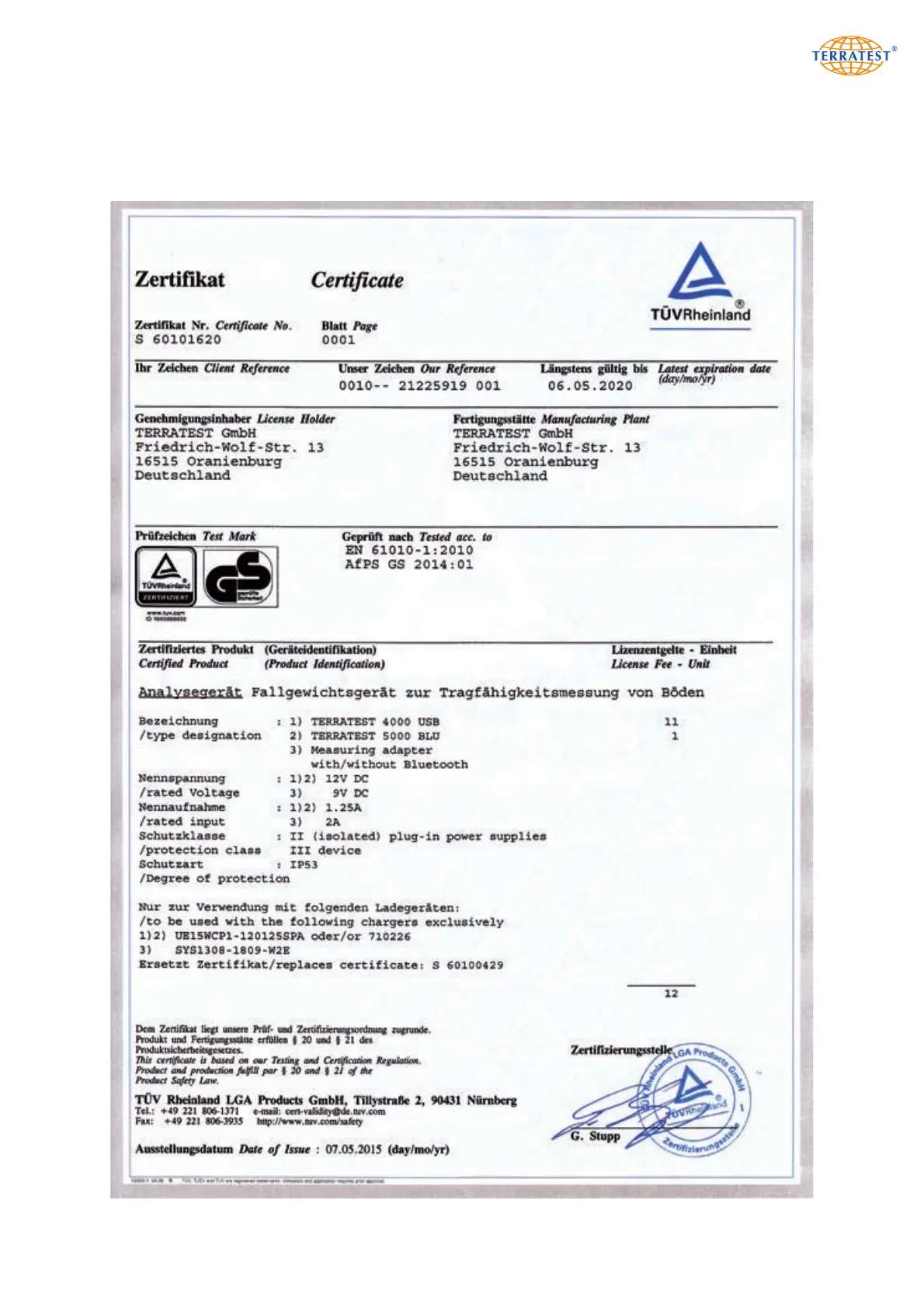 TERRATEST 4000 STREAM - Certificates TÜV Rheinland; TüV Gs