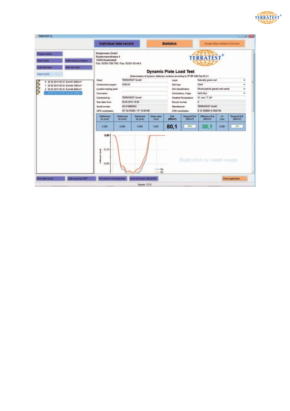 Test protocol with manually entered data. All entered data, except ‘LOCATION TESTING POINT’ and