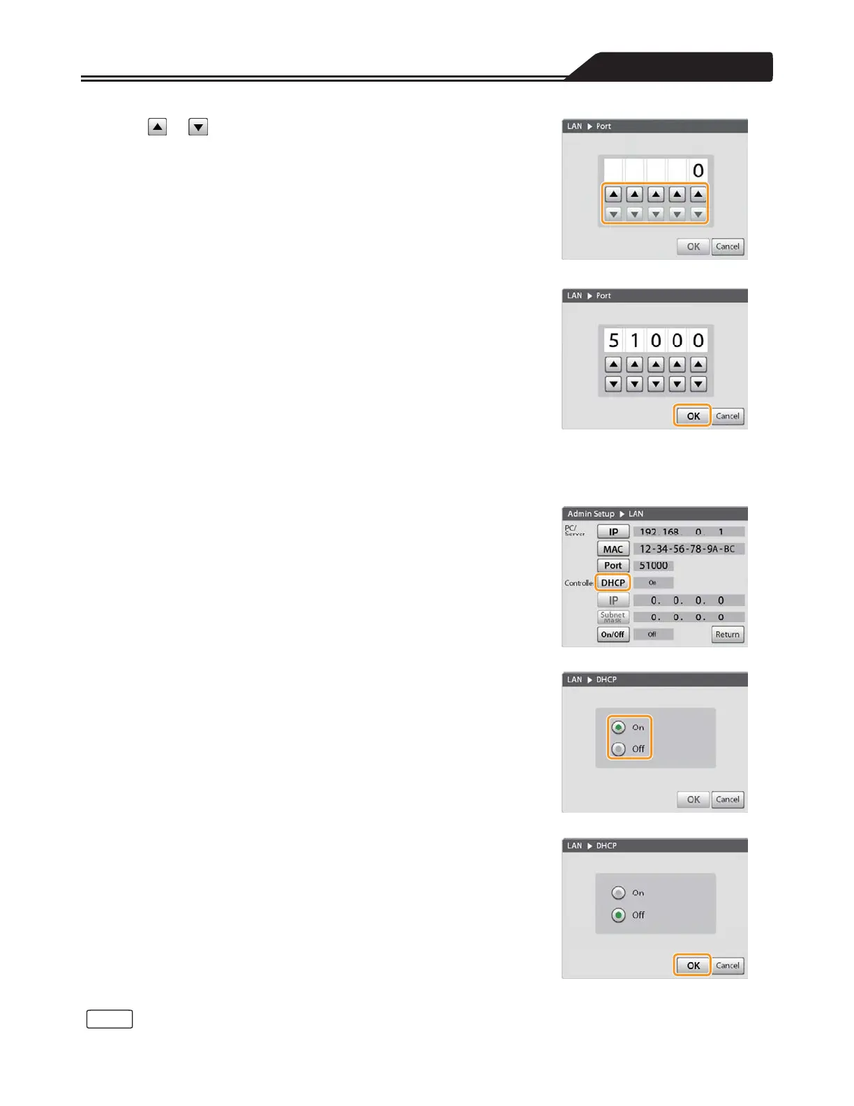 When the DHCP setting is set to [On], proceed to “Setting the On/Off status