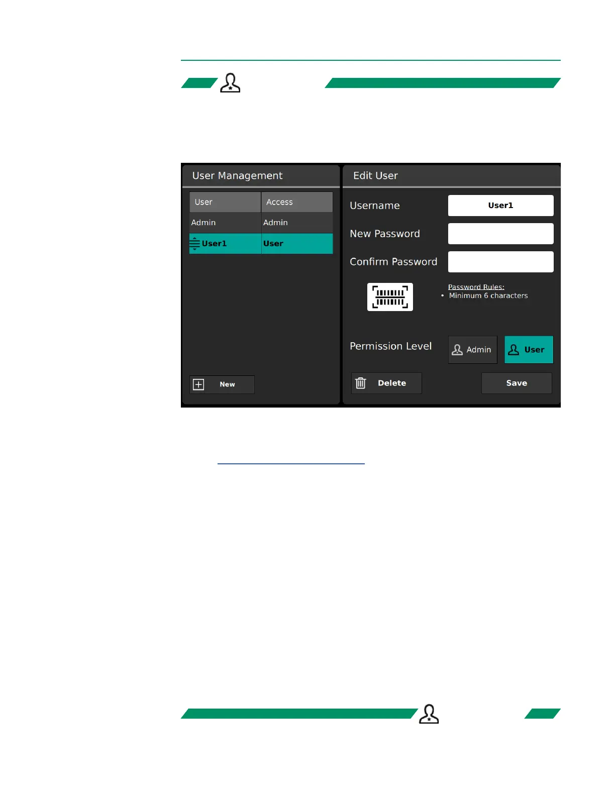• To create a new user, tap New. Enter the username and password, then reenter the
