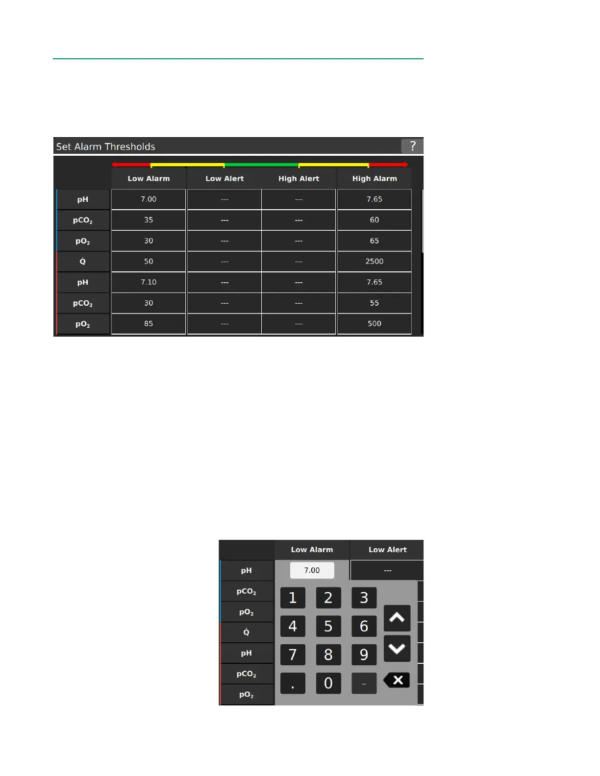 thresholds to notify the user when parameters fall outside of clinically relevant limits.
