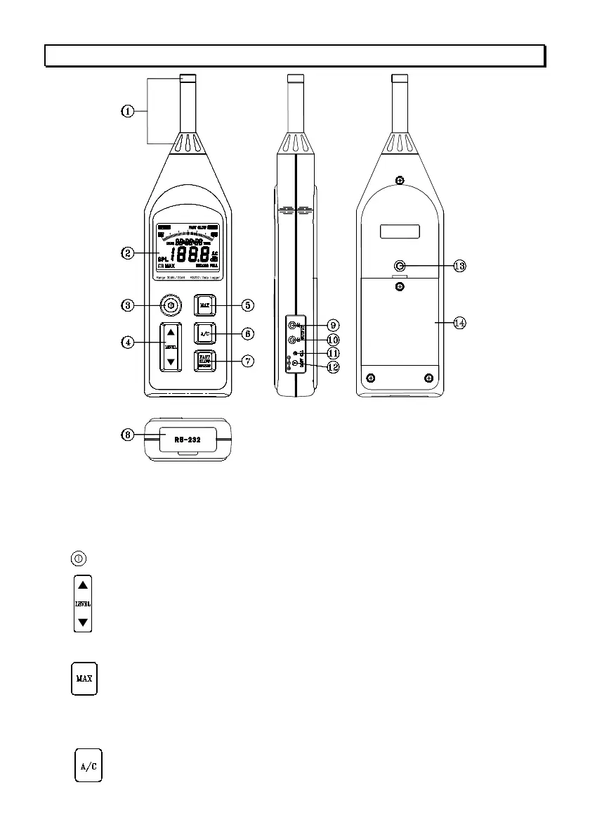 2. Display: The LCD shows the sound level as a numeric value and a bar graph. The