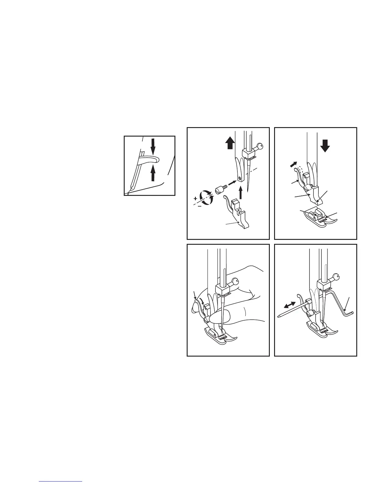 Raise the presser foot. Raise the lever (e) and the foot disengages.