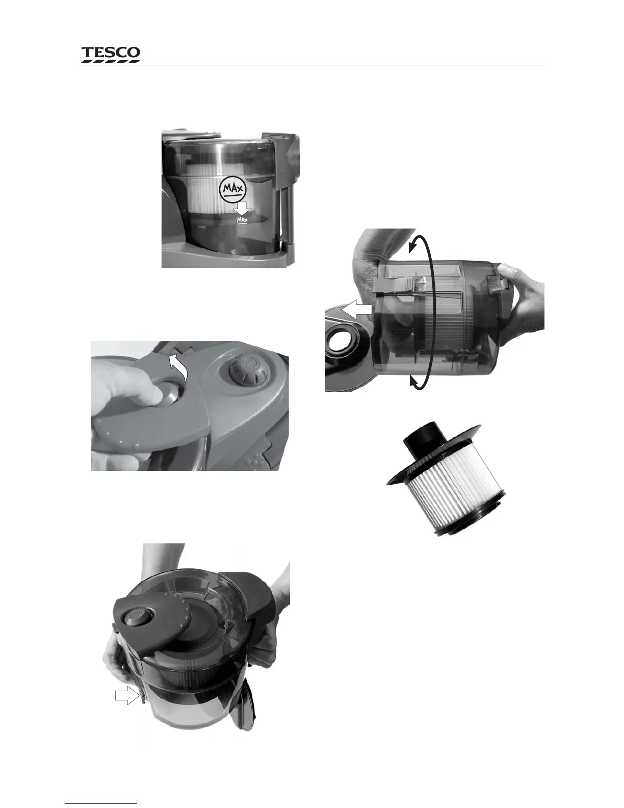 Invert the dust cup over a bin. Press the catch on the lid which