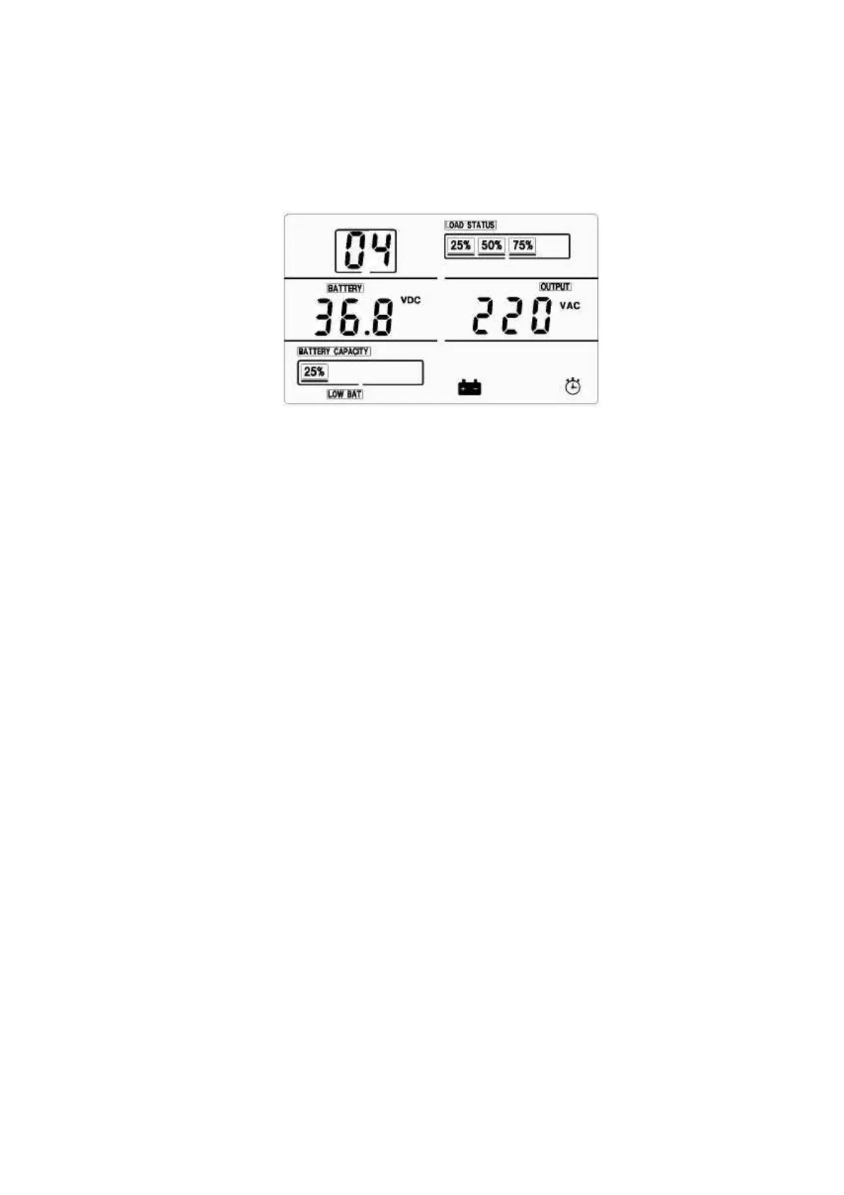 The LCD display in battery mode is shown in the following diagram. The information about the tility