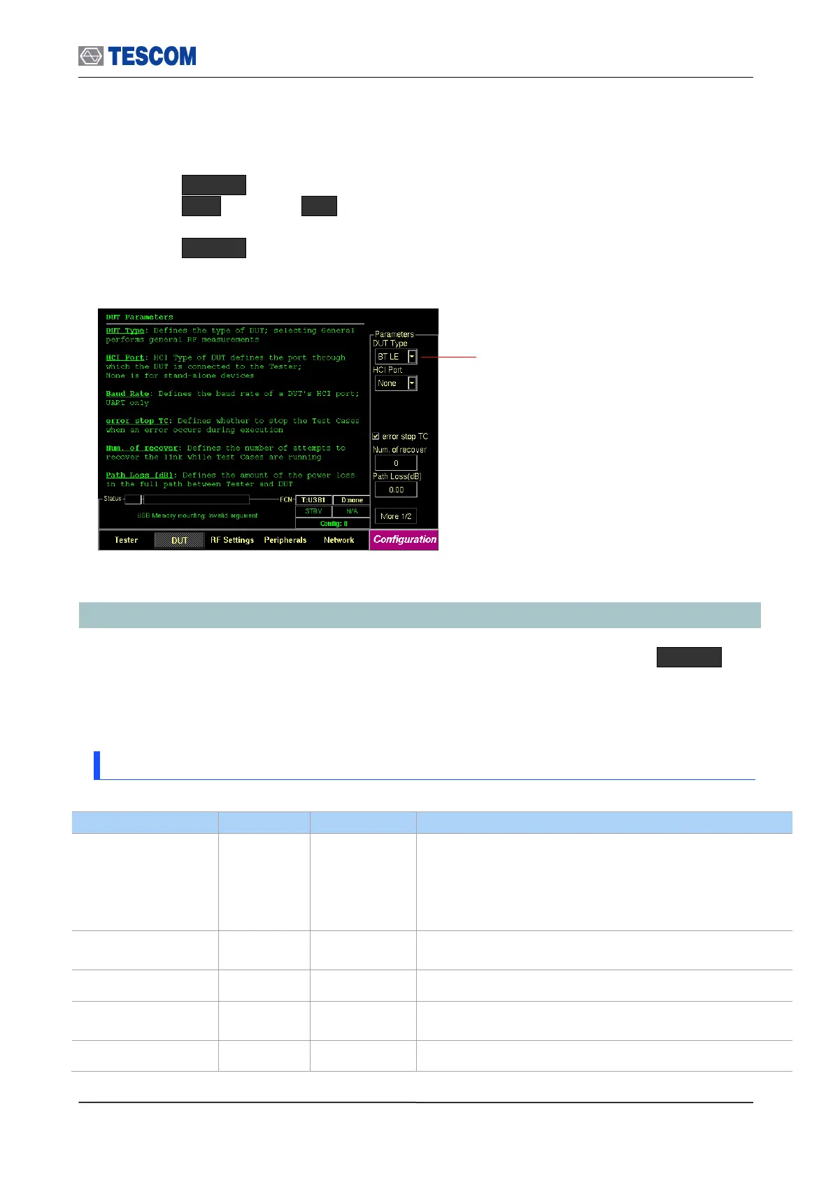 The table below represents the configuration parameters for DUT and TC-3000C.