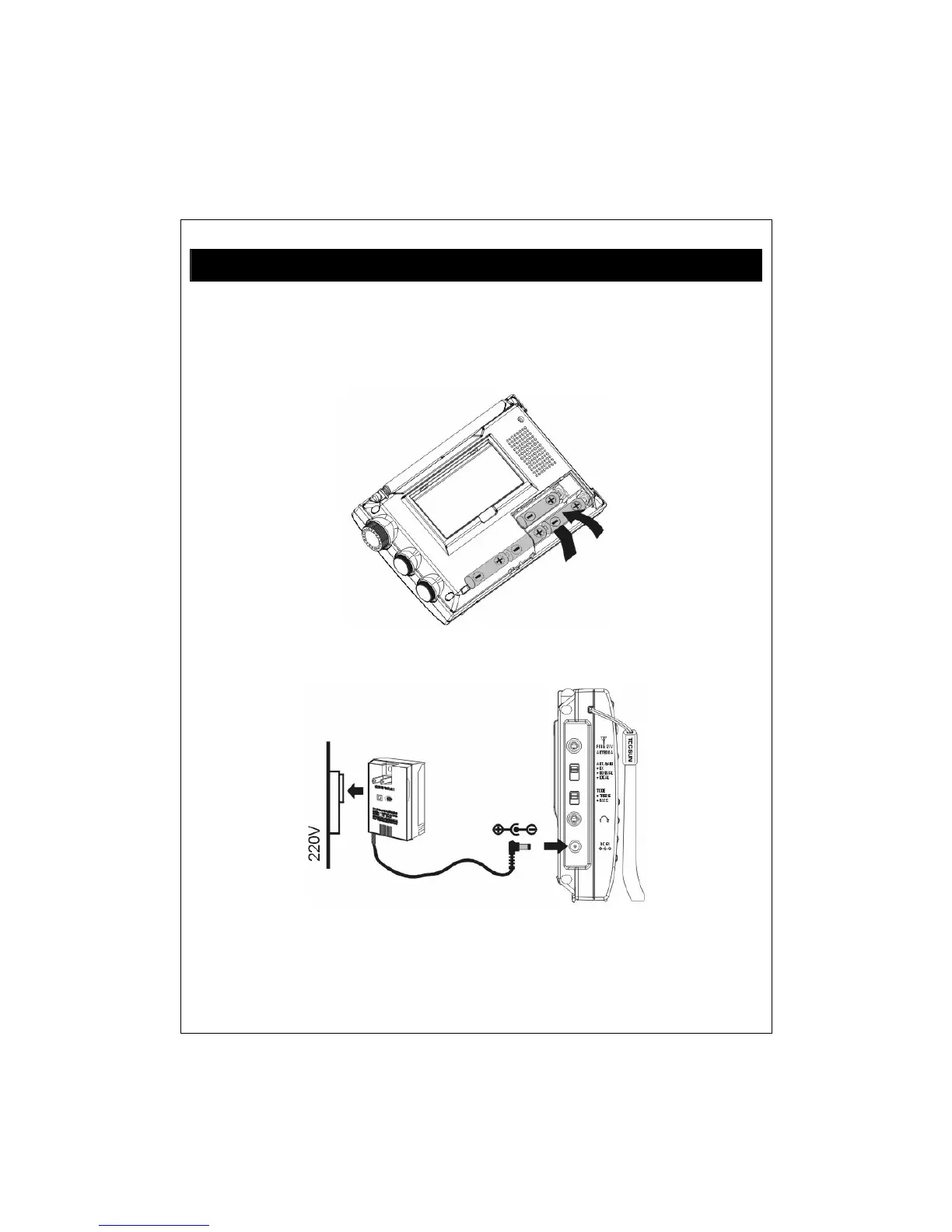 alkaline batteries observing the battery polarity diagram on the back of the radio.