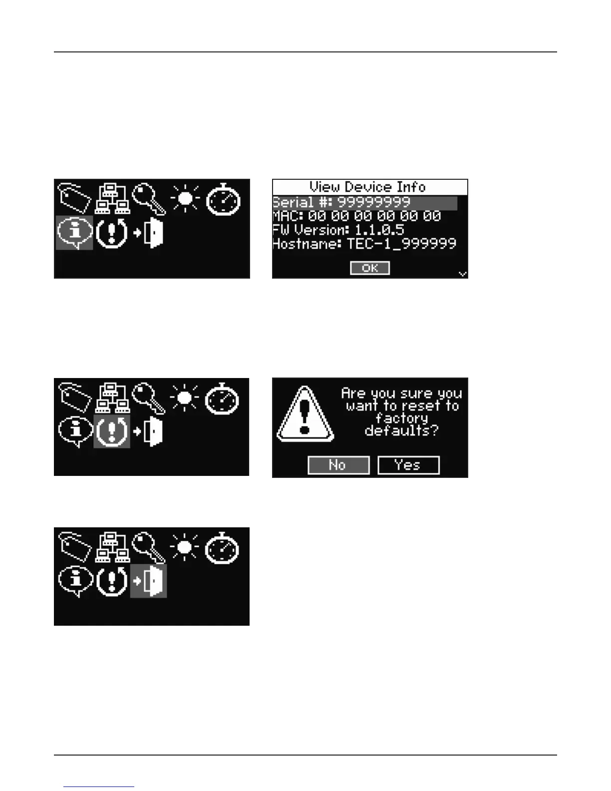 To reset to factory defaults scroll to the reset icon with the exclamation point and press the Select button.